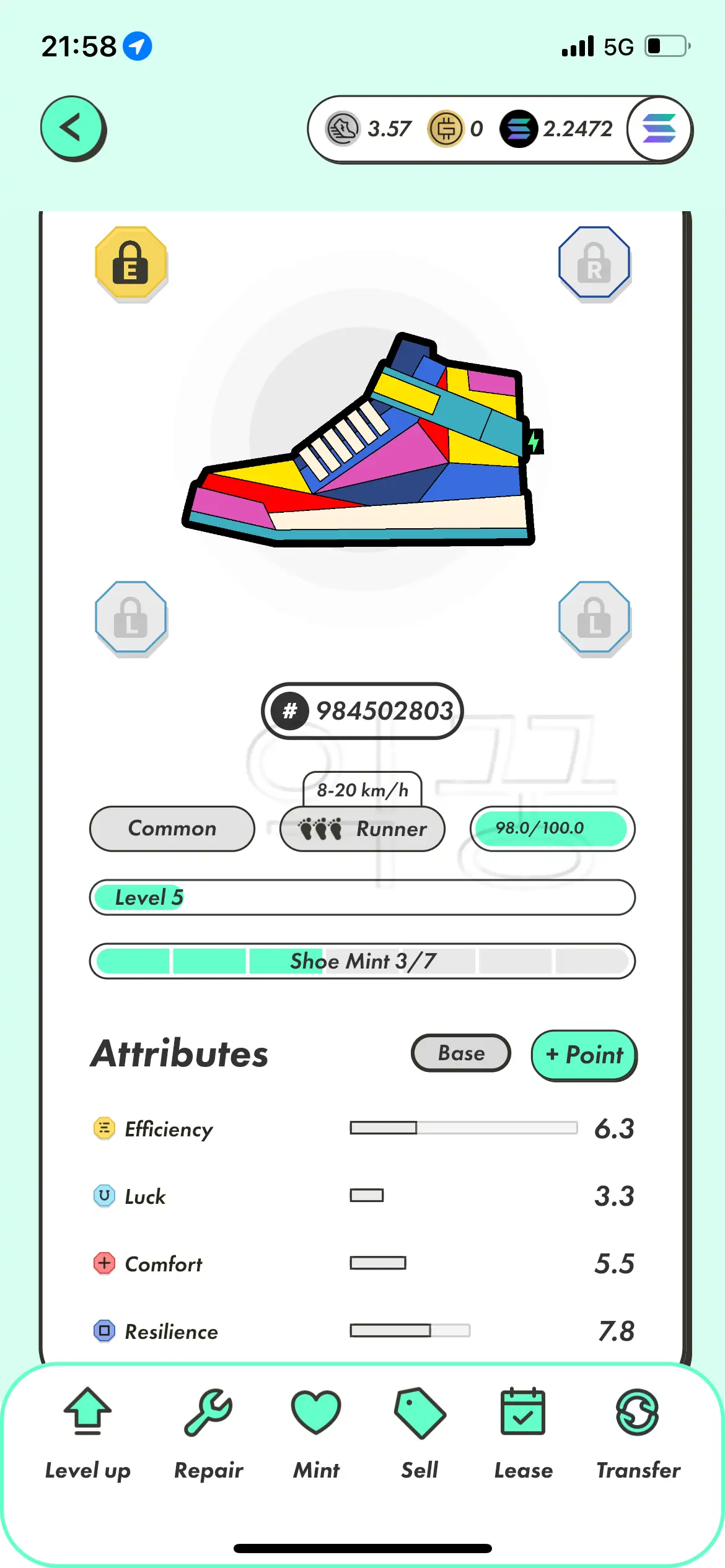 내가 구매한 레벨 5짜리 러너로 GST채굴을 위해서 달려봤다. 결과는 위의 사진처럼 에너지 2를 소모해서 8.67 gst를 채굴했다.