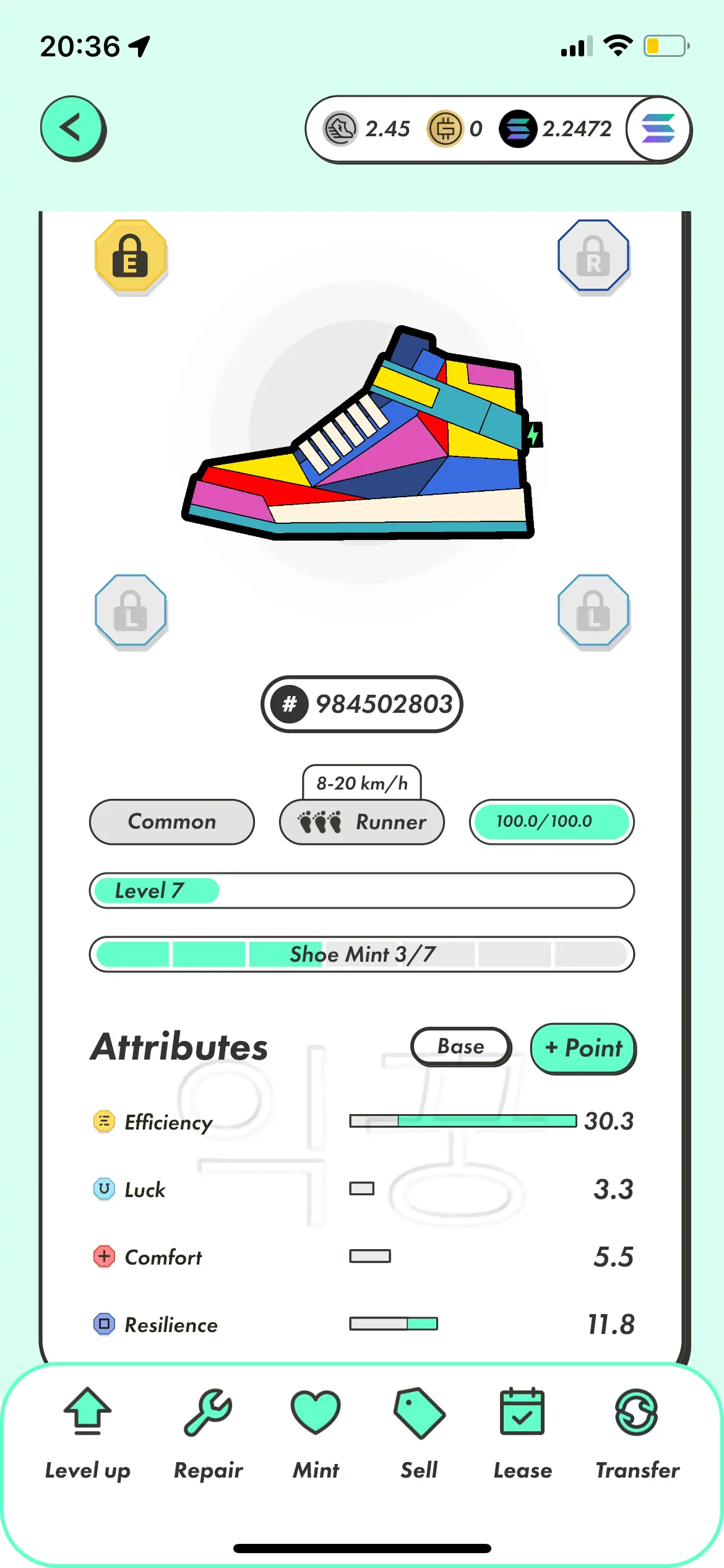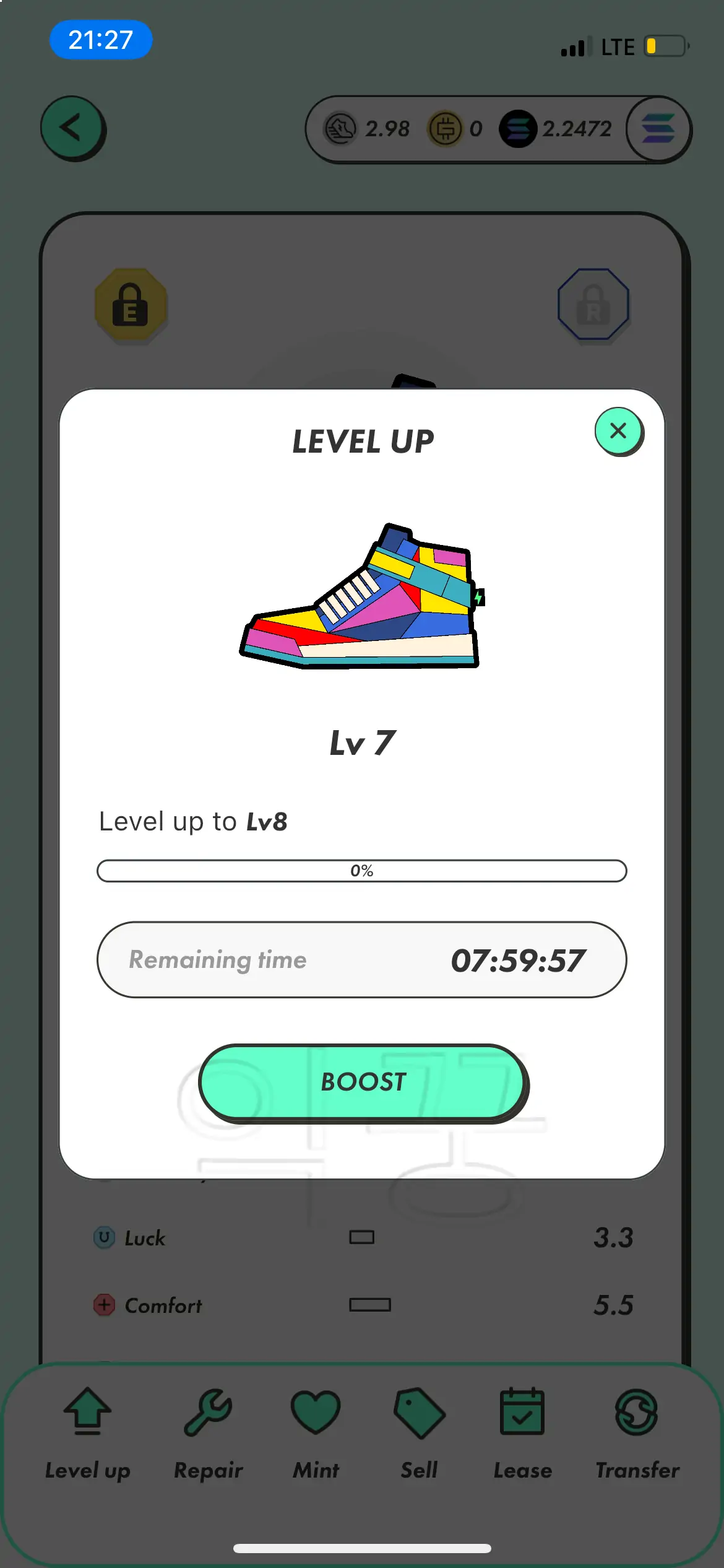 스테픈 러너 9켤레 도전해볼까 하는 생각이 드는 하루였다. 레벨을 올리면 올릴수록 사람이라는 게 욕심이 점점 커지는 것 같다. 하지만 이미 나는 러너 1족으로 멘징까지 달리기로 했기 때문에 빠르게 레벨을 올리고 GST가 높은 가격을 유지할 때 팔아서 현금화를 시켜놓아야만 했다.