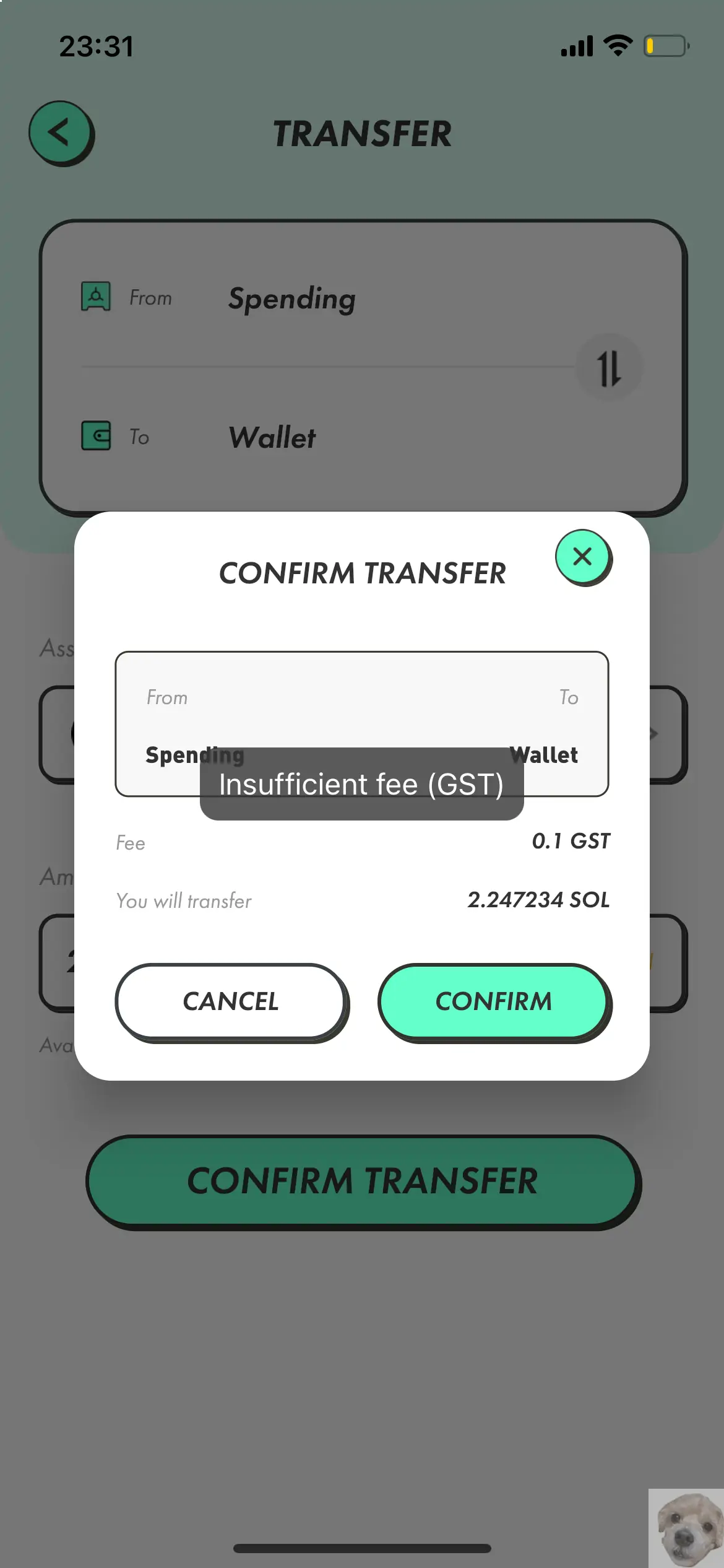 초반에 내가 GST 전량을 SOL wallet으로 다 전송해버린 탓에 스펜딩에서 SOL wallet으로 자산을 보낼 때 드는 수수료로 지불할 GST가 없는 것이었다. (그래서 위에서 GST를 소량 남겨두라고 한 것)