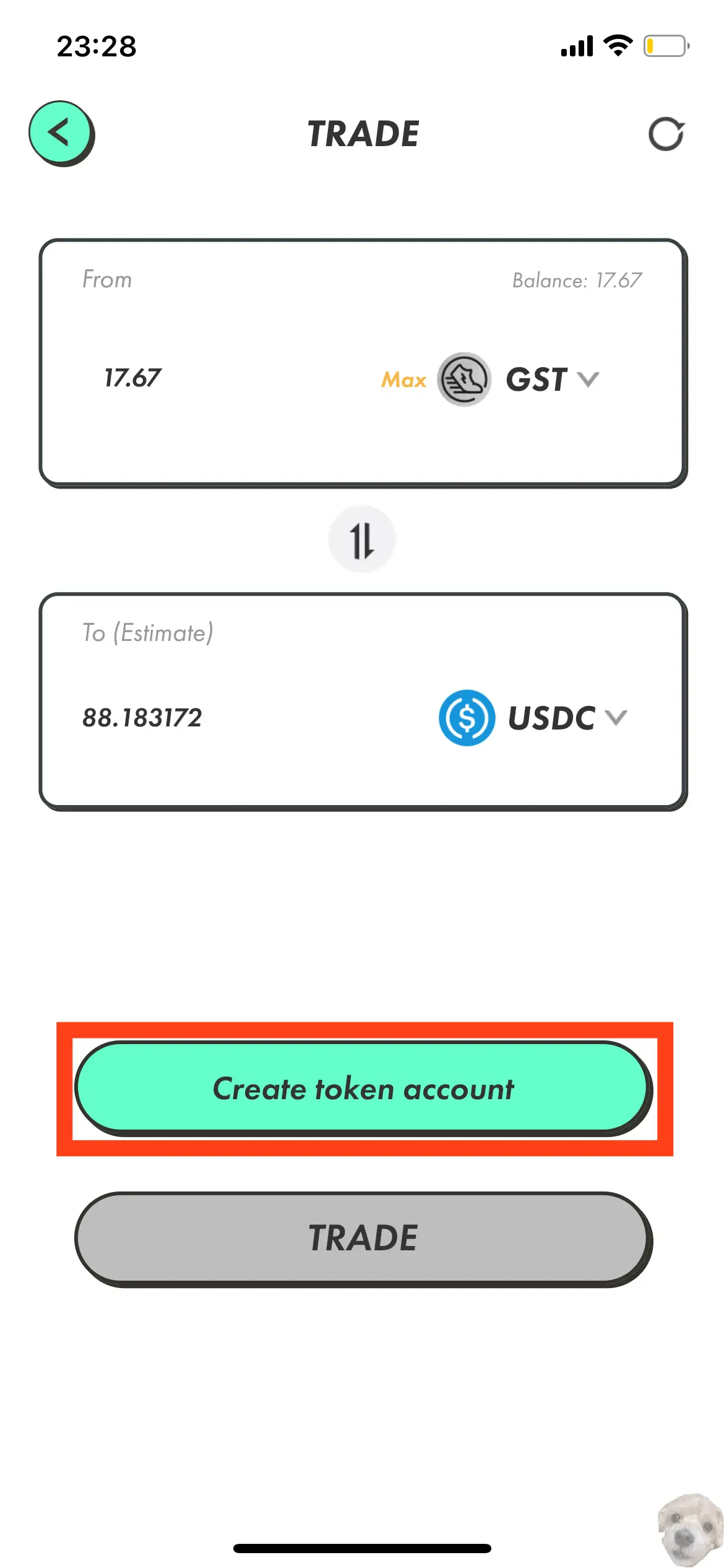 스테픈 앱 내에서 SOL wallet을 처음 만든 사람이라면 GST를 USDC로 스왑 하기 위해서 우측 하단 사진처럼 <Create token account>를 생성해야 할 것이다. 눌러보자. 이때, 반드시 Sol wallet에 0.001 SOL이라도 남아있어야 한다.