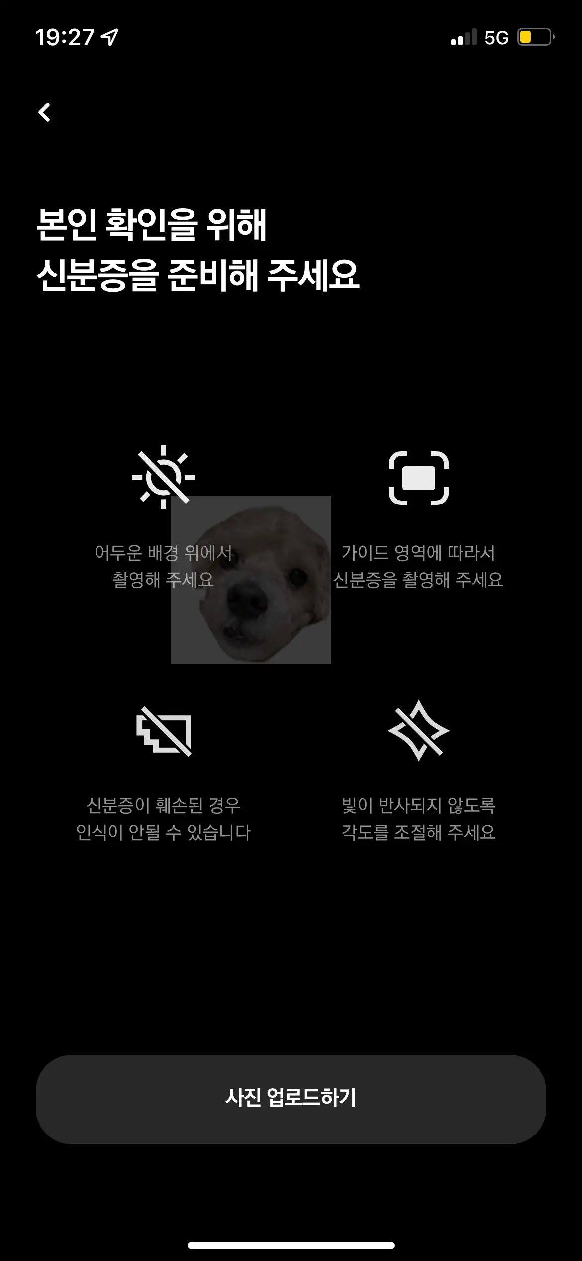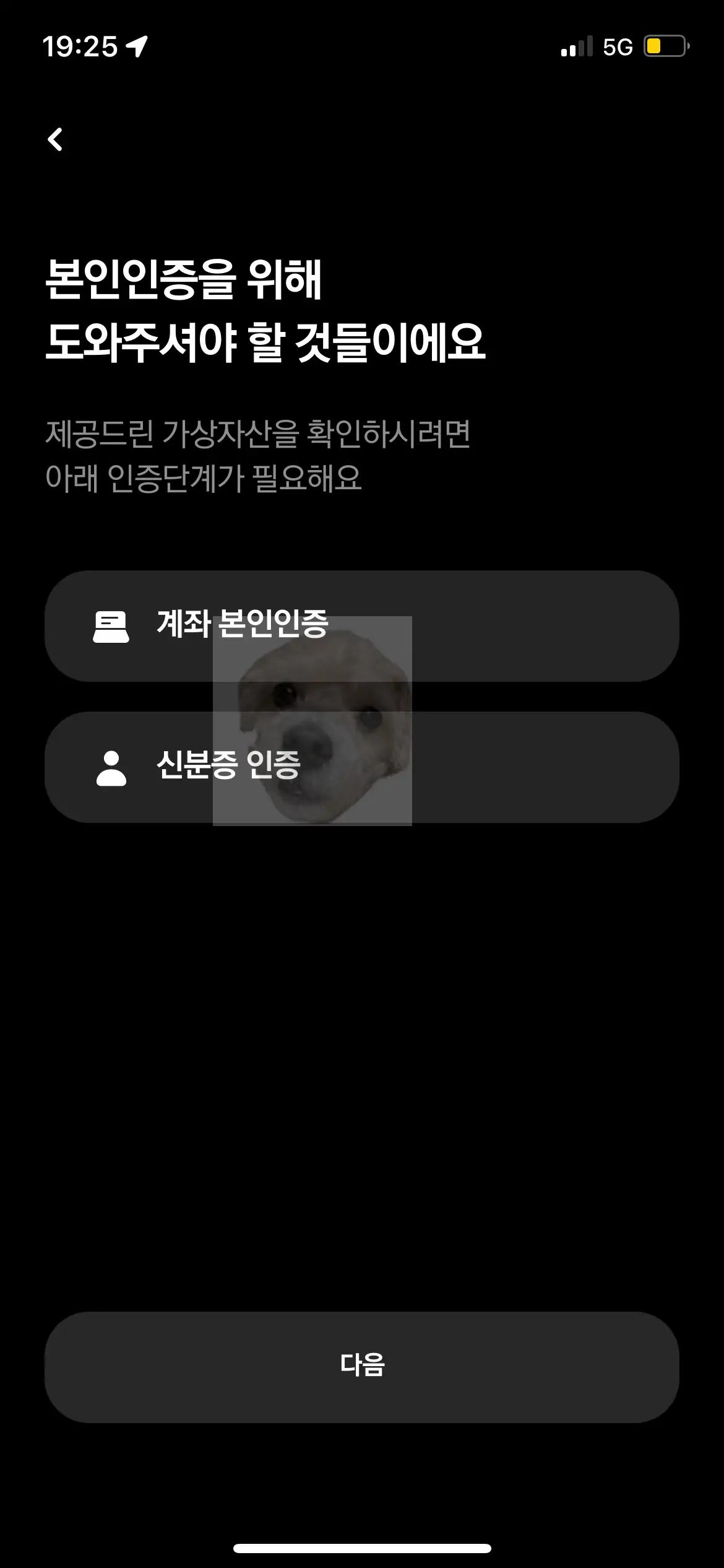 본인인증 첫번째 단계는 계좌 본인인증 그리고 두 번째는 신분증을 통한 인증이다. 다른 거래소에서 KYC하는 것과 비슷하다고 생각하면 편할 것이다.