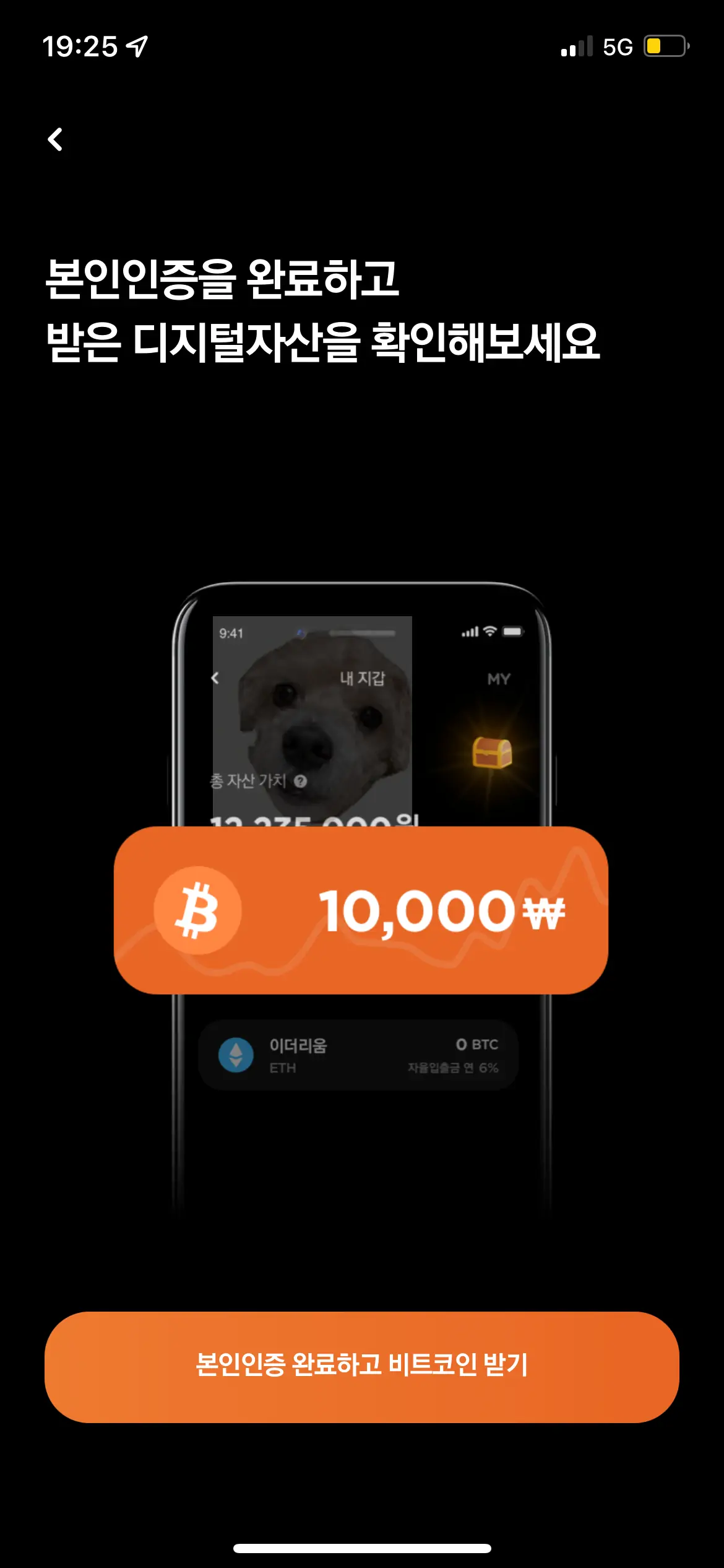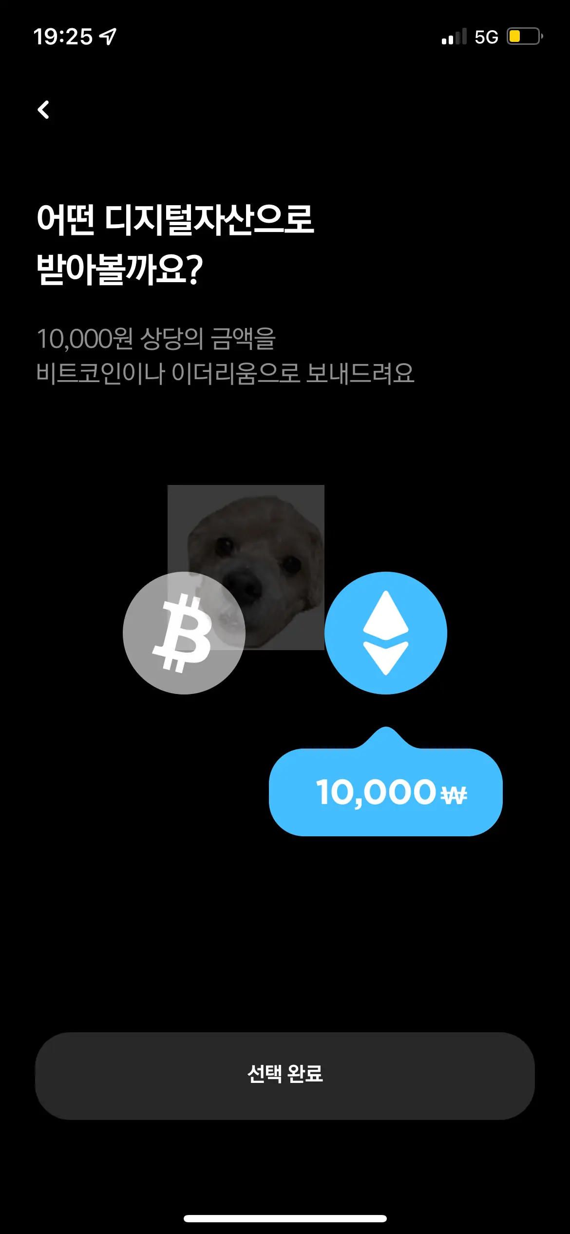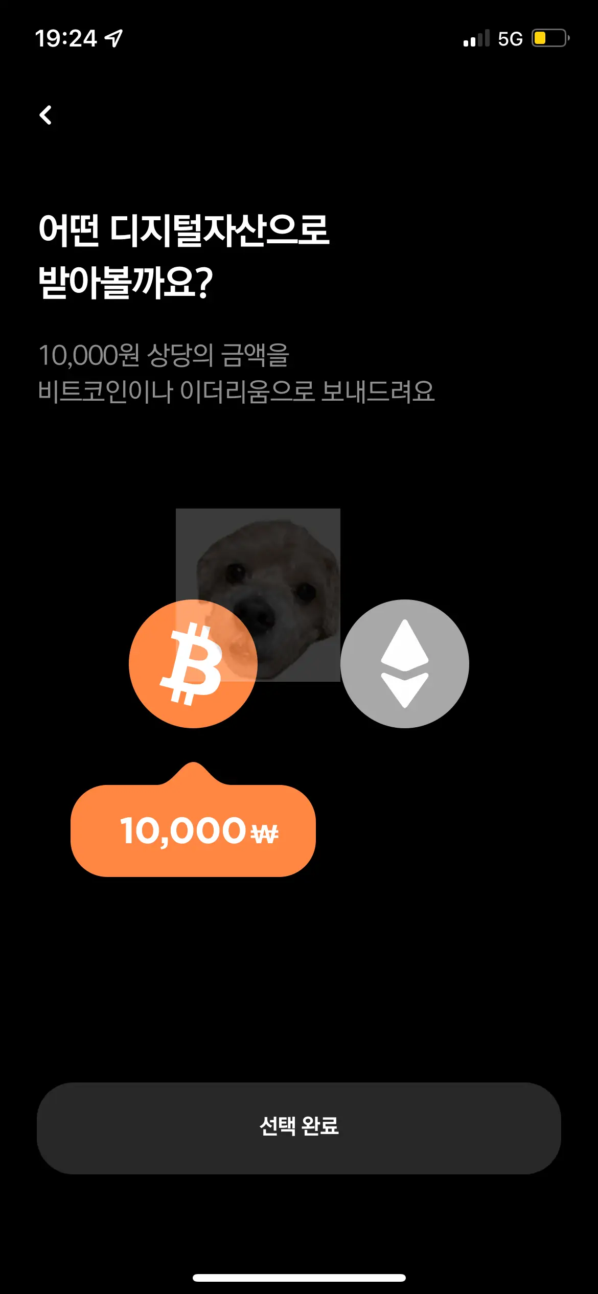 암호화폐지갑을 만들고 내가 받을 암호화폐를 선택하는 것이다. 선택지는 비트코인/이더리움 둘 중 하나고 이 둘 중에서 내가 받고 싶은 암호화폐를 1만 원어치 받는다고 생각하면 된다.
