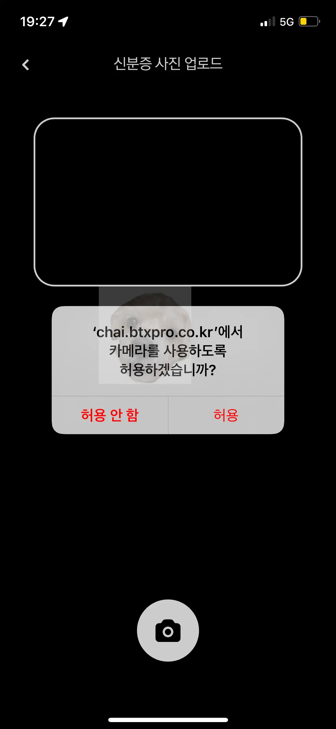 신분증 본인인증을 위해서는 사진을 촬영하고 업로드 해줘야하는데, 기본적으로 아이폰/갤럭시 모두 차이 어플에 카메라에 대한 '접근권한'을 허용해야 한다.