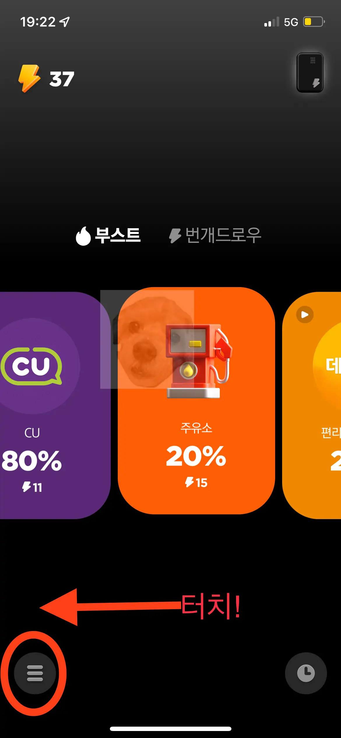 차이 어플을 켜면 아래 좌측과 같은 사진이 나타난다. 내가 적용받을 수 있는 번개 혜택들과 함께 아래에 빨간색으로 '동그라미 표시' 해놓은 곳을 터치해보자.