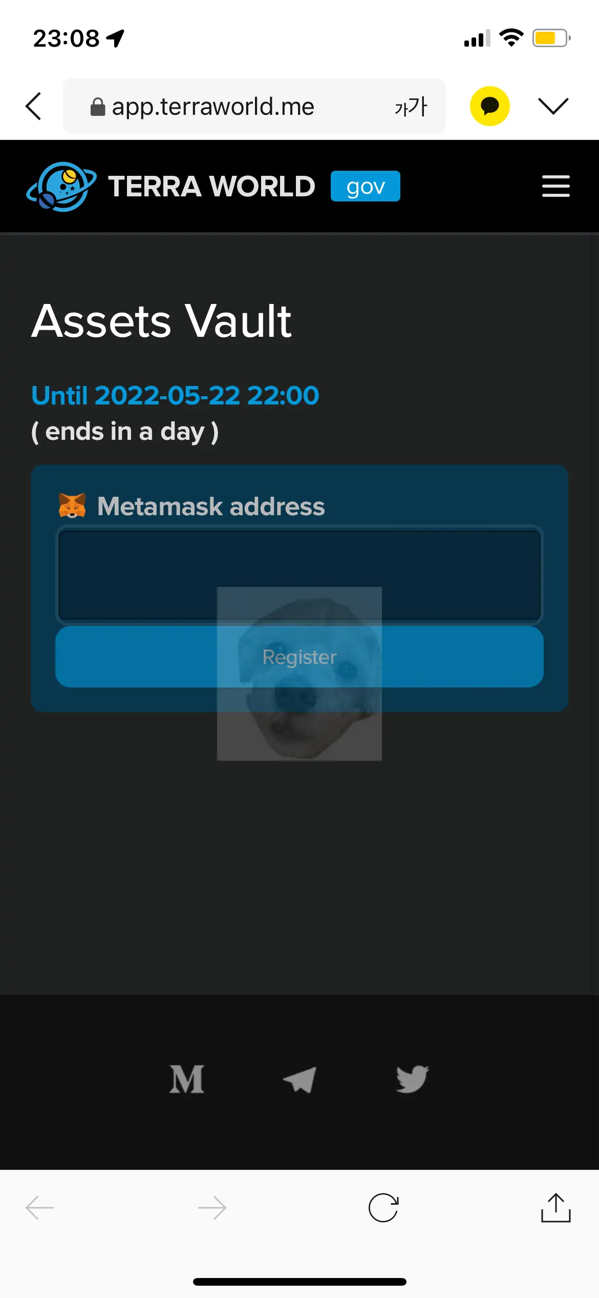 하단 좌측 사진처럼 메타마스크 주소를 입력했다면 [Register] 버튼을 눌러서 완료해주자. 이때 소량의 UST를 전송 수수료로 내야 하니 테라스테이션에 조금의 UST는 반드시 있어야 한다는 점.
