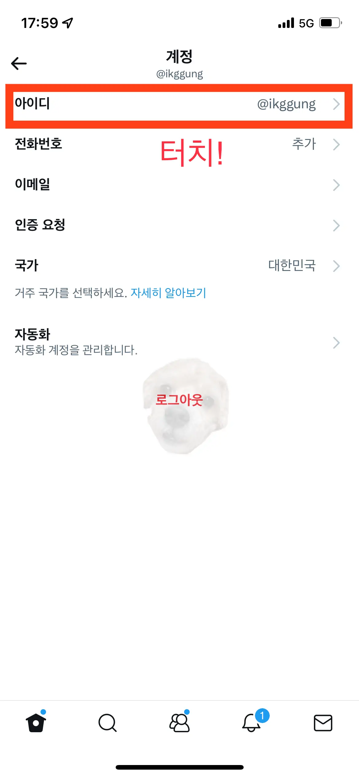아래에 첨부된 사진에서 보면 '익꿍'이라는 이름 아래에 보이는 [@ikggung] 부분이 아이디가 되겠다. 아이디 변경을 위해 아래 사진에서 보이는 [설정 및 개인정보보호] 메뉴를 터치해준다.