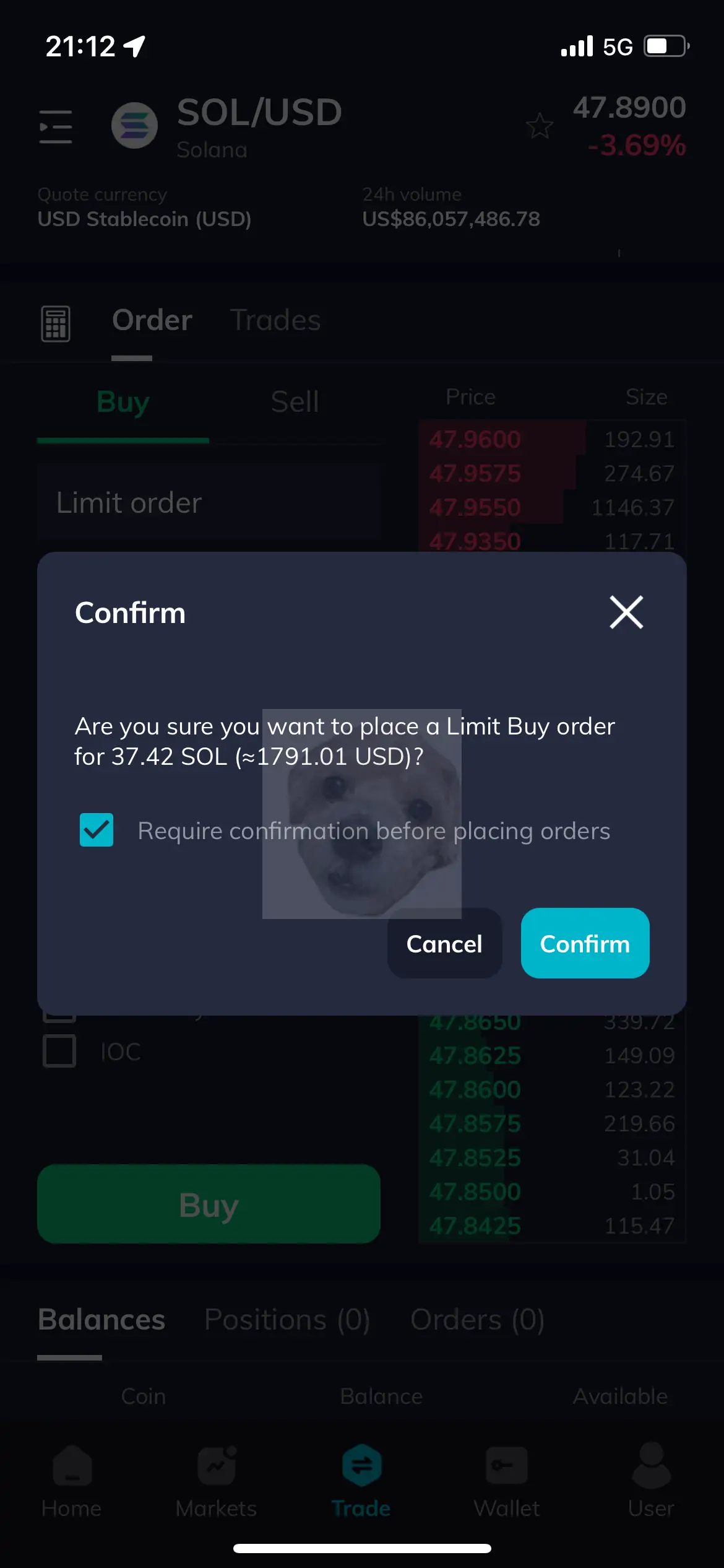 거래소에 입금이 잘 되었는지 확인하려면 약 4-5분 정도 시간이 소요되며, FTX 거래소로 기존에 입금되어 있었던 트론을 USD로 바꿔서 모두 SOL을 구매하기로 했다.