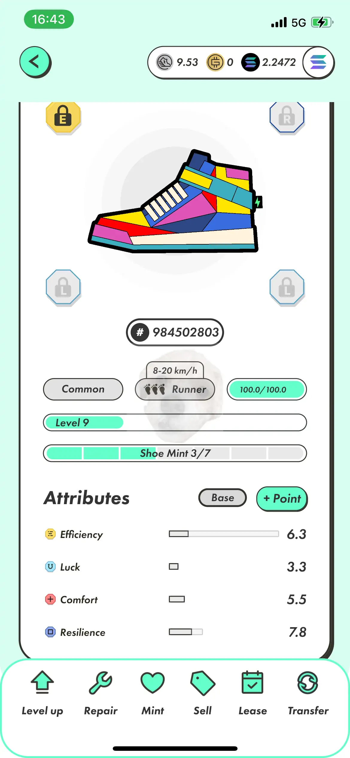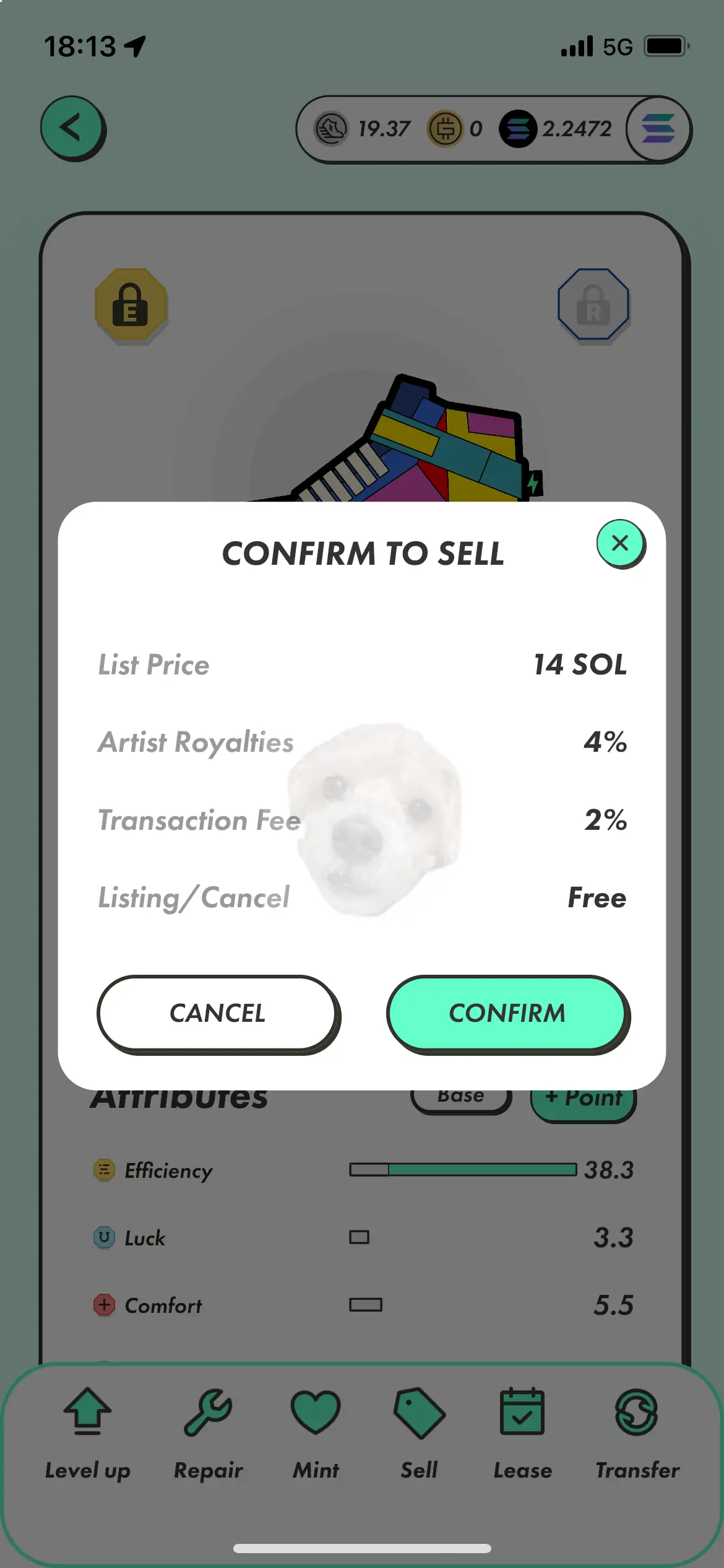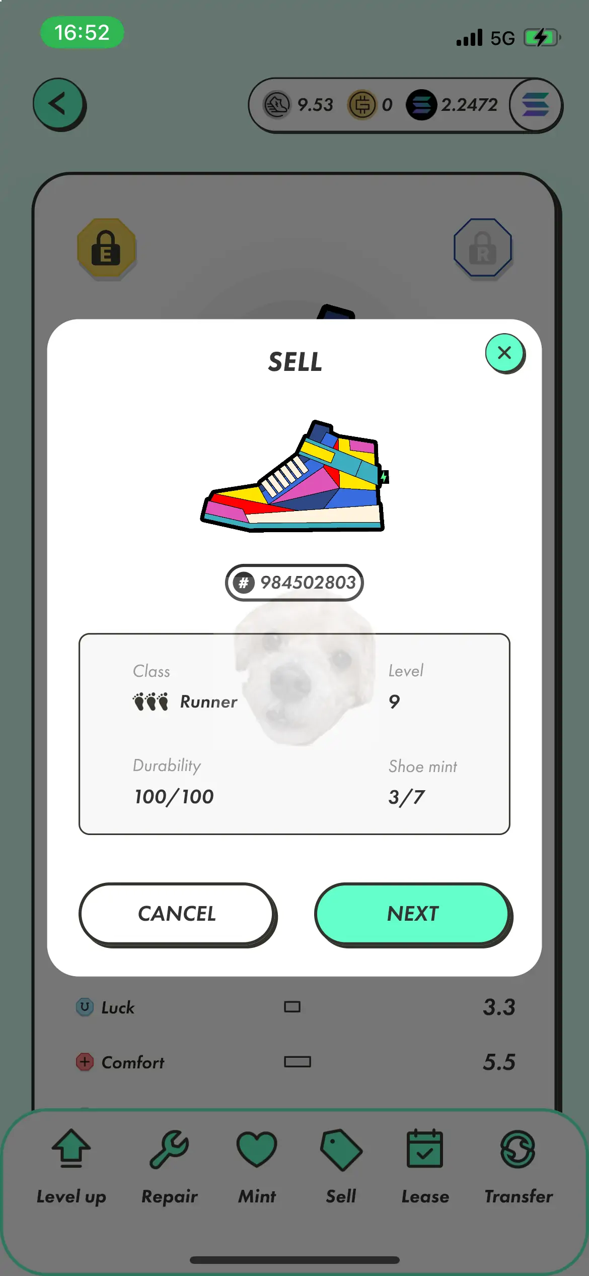 스테픈을 그만하기로 마음을 먹은 이후에 마켓에 신발을 판매하기 위해서 리스팅 하기로 했다. 스테픈의 신발은 각각이 기능을 가진 NFT로 마켓에서 SOL(솔라나)로 거래가 된다.