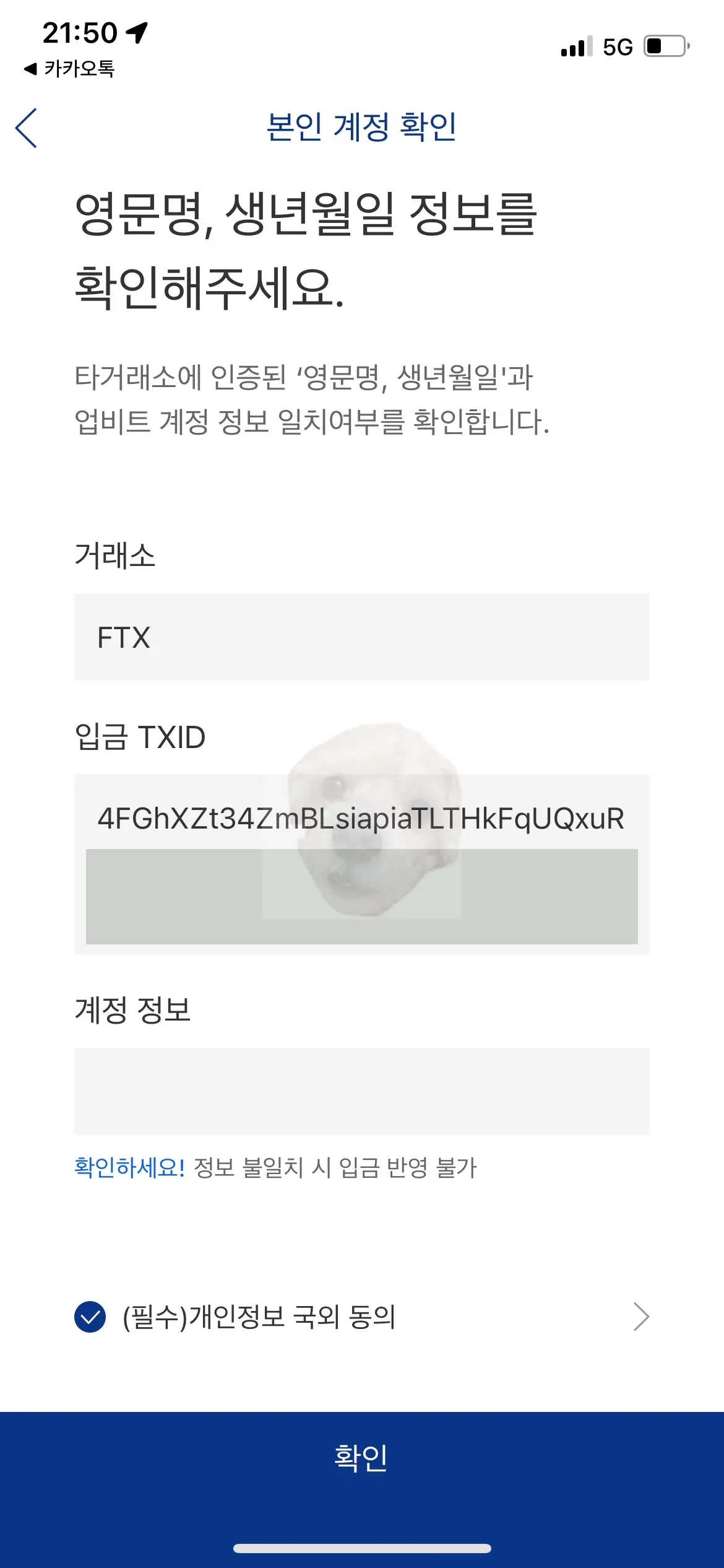 여기서 거래소를 선택하고 계정 정보와 생일이 모두 일치하는지 확인하고 [확인] 버튼을 눌러주면 모든 입금 절차가 완료된다.