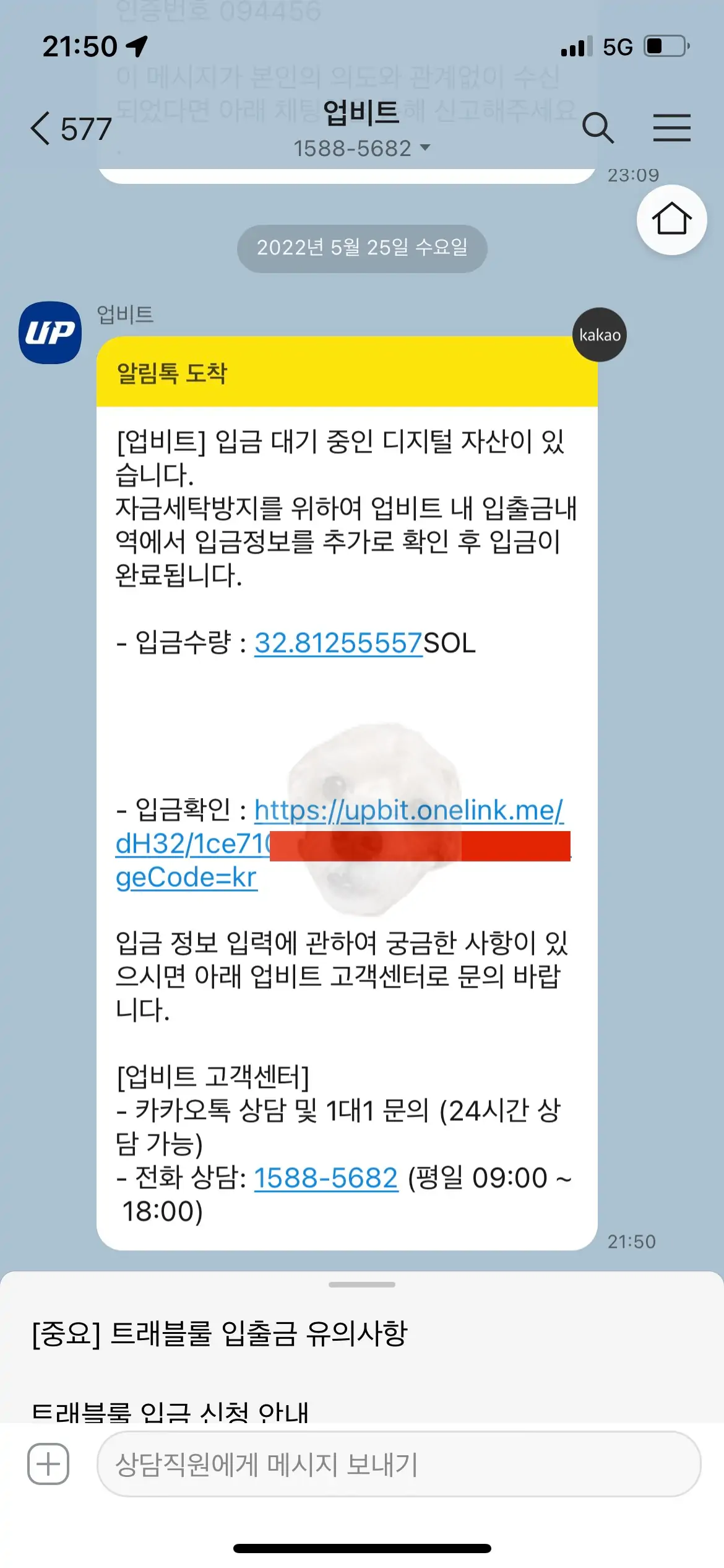 100만 원 이상의 가상자산이 한 번에 입금되면 업비트에서는 입금 절차 완료 전에 아래의 사진처럼 카카오톡으로 메시지를 보낸다. 업비트 카톡 메시지 내용 중 '입금확인'을 통해서 KYC가 완료된 거래소와 실명이 일치하는지를 확인하는 작업이다.