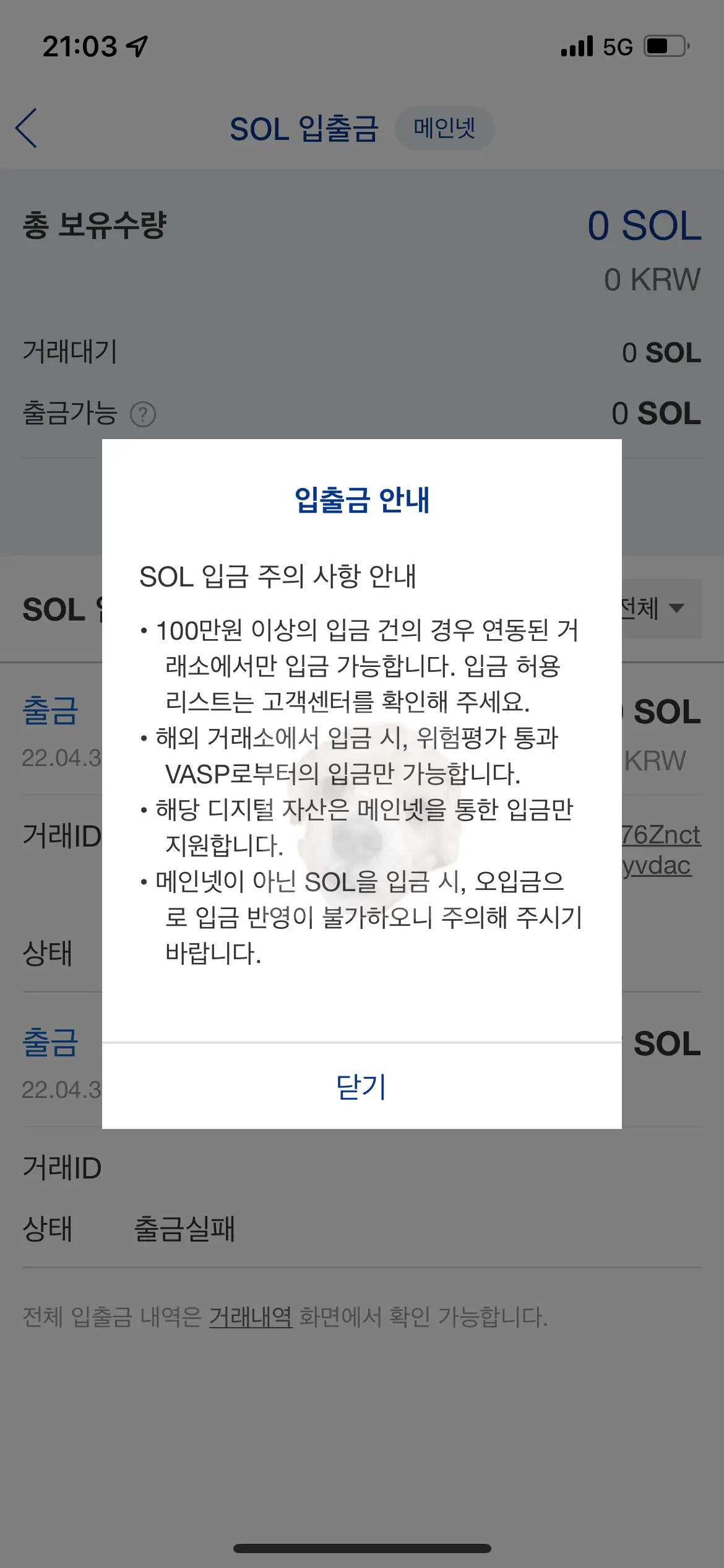 해당 링크를 누르고 [추가 확인]이라는 버튼을 [업비트 SOL 입출금 내역]에서 찾아서 클릭하면 아래 사진과 같은 화면이 나타나게 된다.