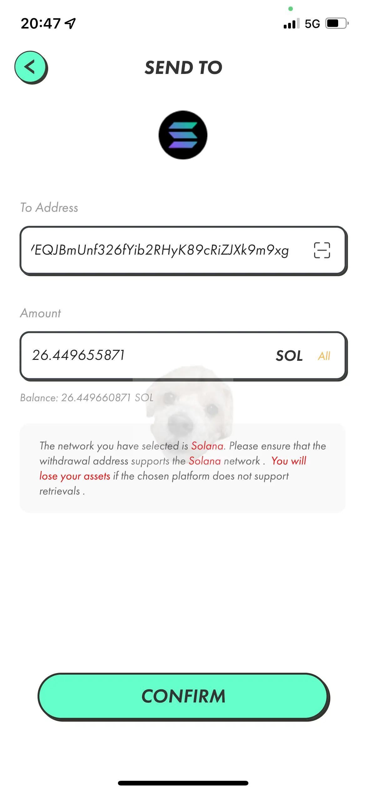 FTX거래소에서 SOL 전용 입금 주소(Deposit)를 발급받은 후에 해당 주소를 우측 하단의 사진처럼 입력해주고 모든 솔라나 전송을 CONFIRM 해주면 전송된다.