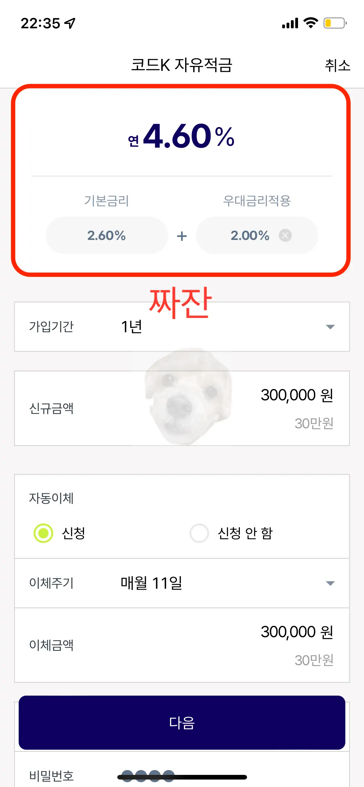 우대금리 코드를 입력했다면 아래 사진처럼 적금의 금리가 연 4.6%로 변경된 것을 확인할 수 있을 것이다. 하지만 내 경우는 1년으로 설정했기 때문에 4.6%를 받은 것이다.