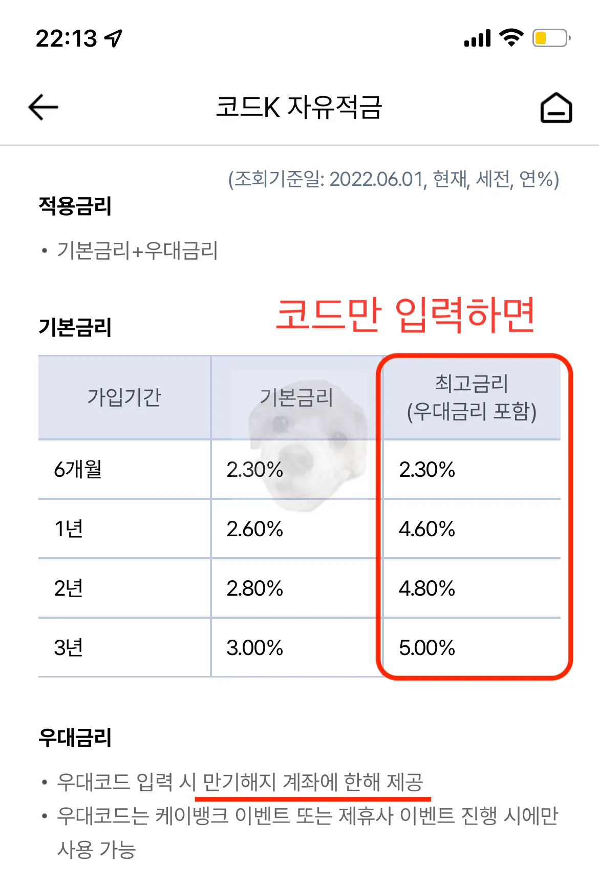코드 K 자유적금 가입하기 전에 아래의 안내사항들을 읽어보면 도움이 된다. 특히 우리는 어떻게 해야 '우대금리'를 받을 수 있는지 알아봐야 하는데 해당 적금상품은 '코드만 입력하면' 우대금리를 모두 챙길 수 있는 아주 좋은 적금상품이다.