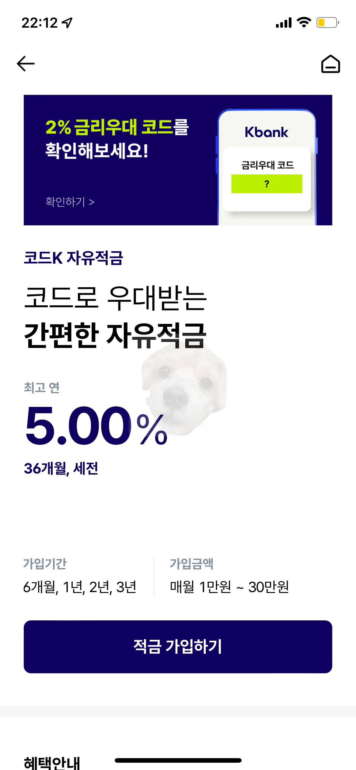 코드 K자유적금은 '케이뱅크'에서 진행하는 이벤트 적금 상품으로 무조건 해당 은행의 뱅킹 앱을 설치하고 계좌를 개설해야만 가입이 가능하다.
