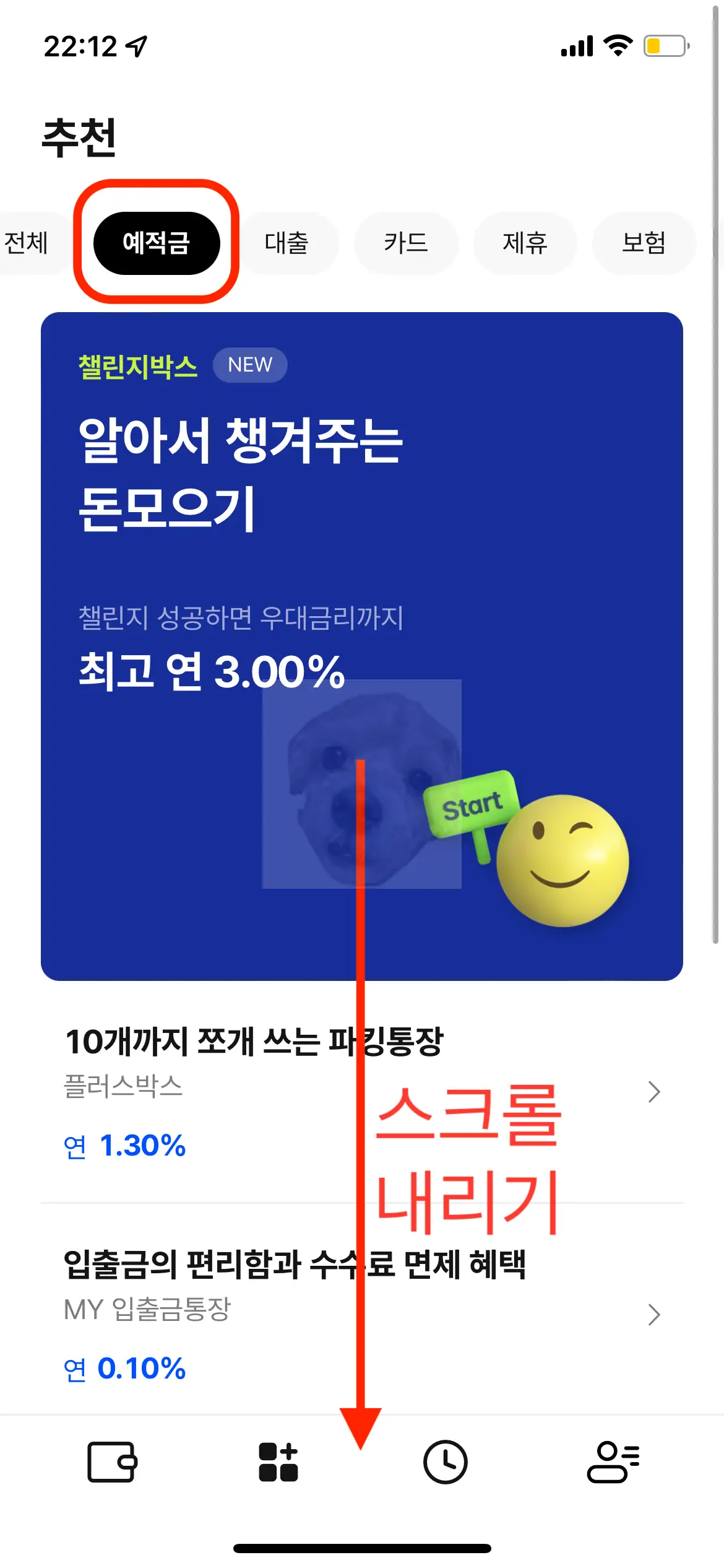 앱 설치 후 [예적금] 항목을 터치하고 스크롤을 아래로 내려보자.