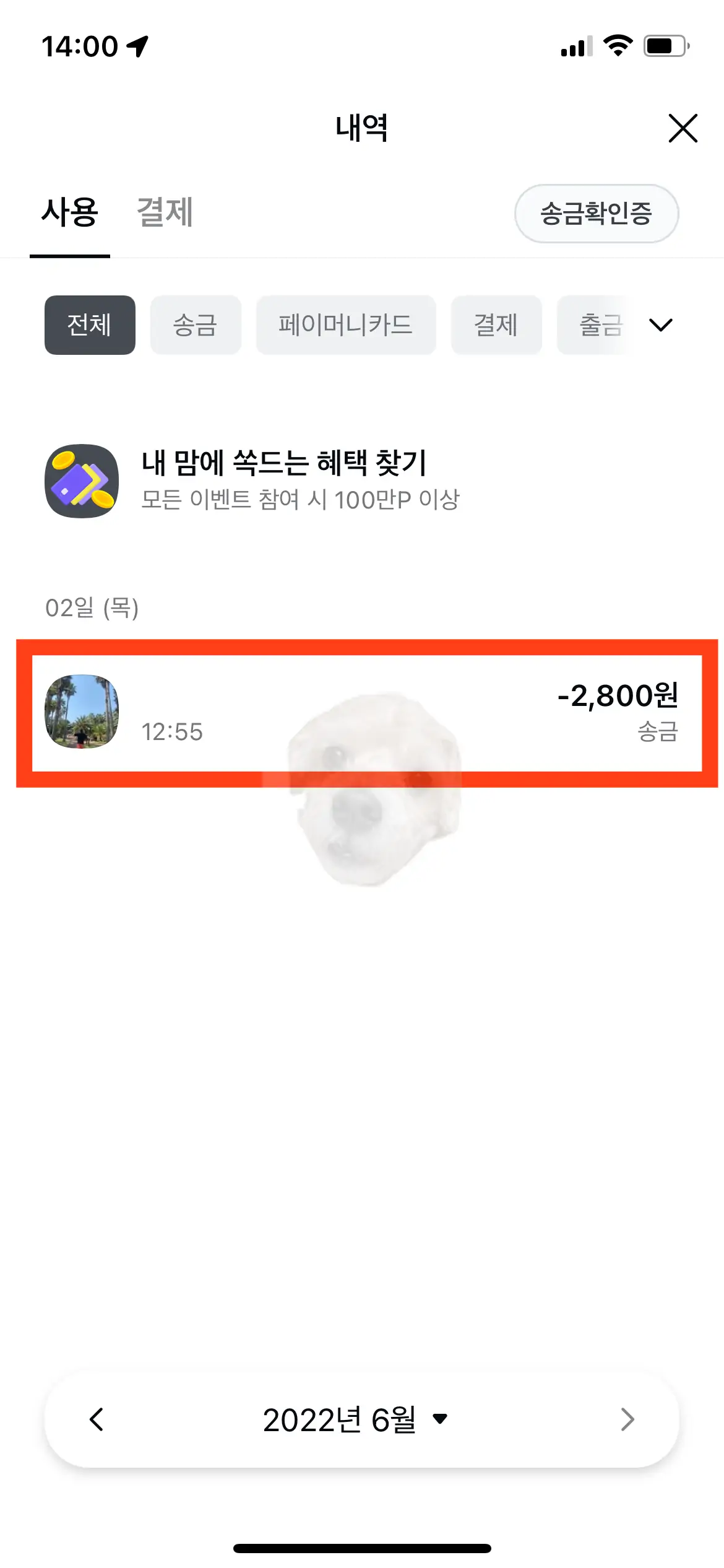 위에서 [내역 보기]를 눌렀다면 아래 사진처럼 누구에게 몇 시에 얼마를 송금했는지 카카오 페이에서 모두 보여준다. 내 경우는 2,800원을 송금했었는데 해당 금액을 잘못 보내서 취소하고자 한다.