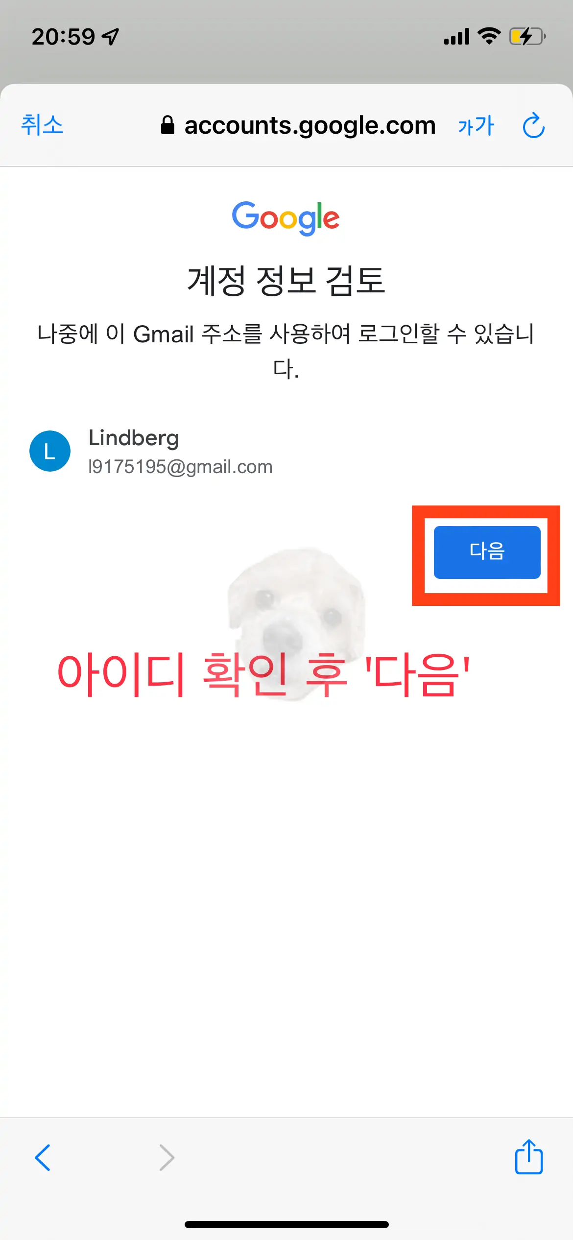 아이디 확인 후 동의하고 계정 만들기 터치