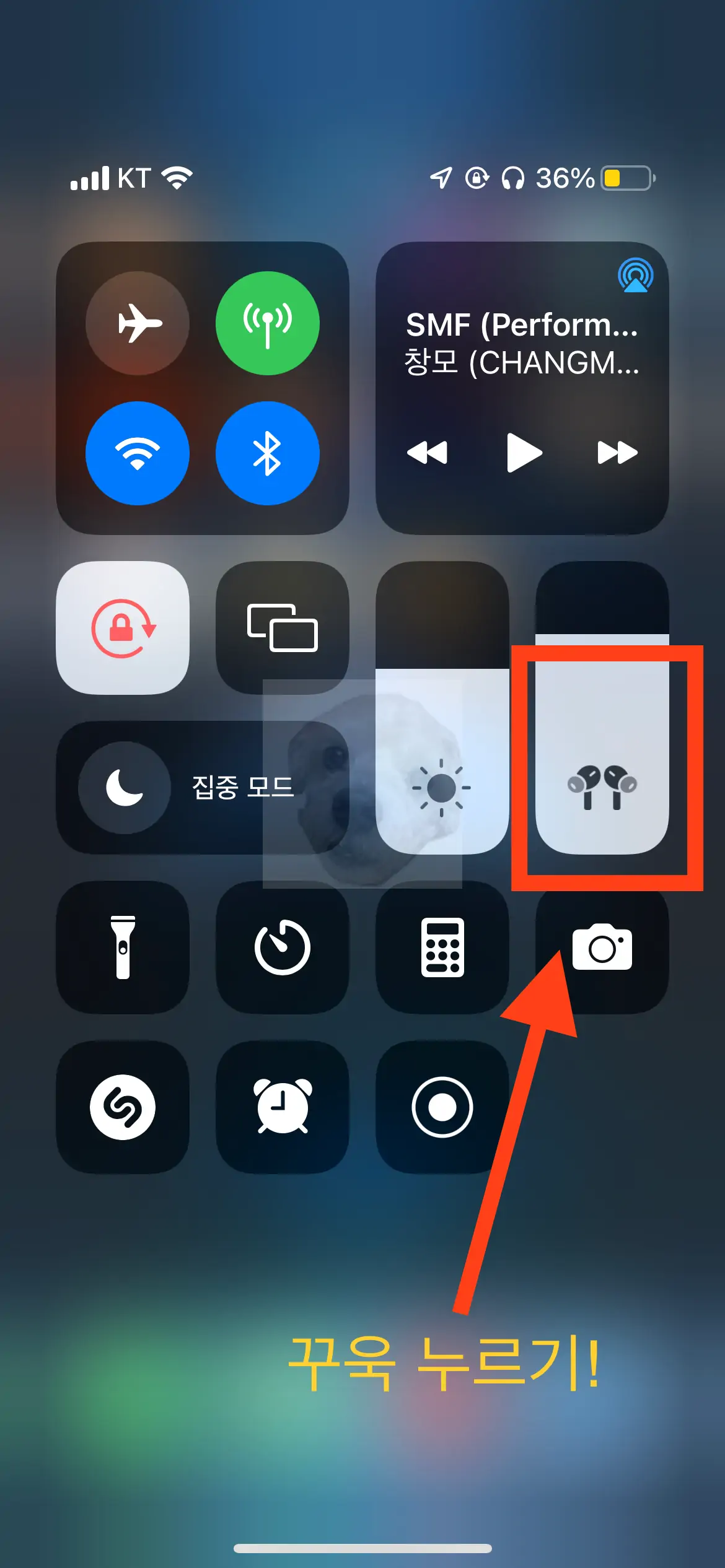 [제어센터]에서는 와이파이나 블루투스, 화면 밝기, 손전등, 알람 설정 등 다양한 기능에 대해 손쉽게 제어가 가능하다. 그중에서 우리는 아래 사진처럼 에어팟이 잘 연결되어있는지 그리고 '에어팟 모양 그림'이 잘 보이는지 확인해주어야 한다.