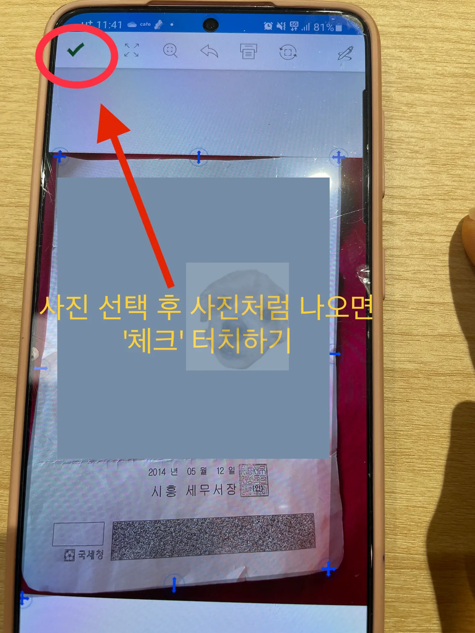 갤러리에서 팩스로 전송할 사진을 찾아서 선택하면 좌측 사진과 같은 화면이 나온다. 그러면 내가 보내고자 하는 사진이 정상적으로 첨부되었는지 확인 후에 [체크]부분을 터치해준다.