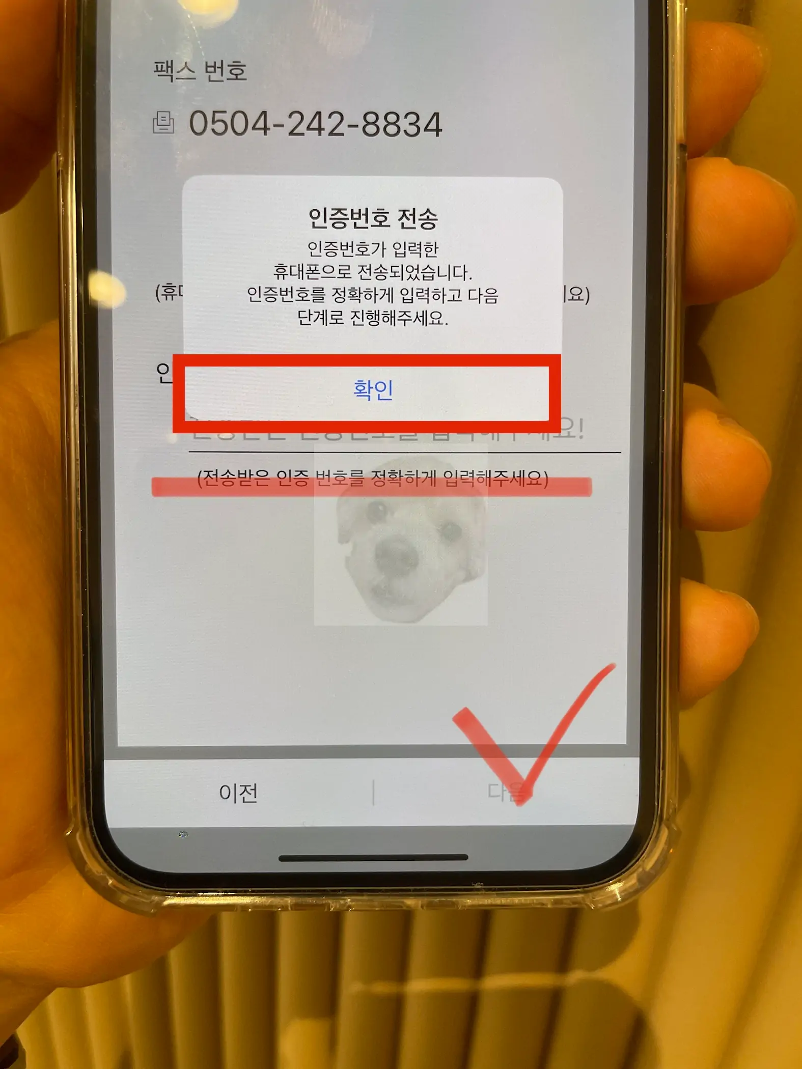 인증번호가 전송되었다는 메시지가 아래처럼 나오면 [확인]버튼을 누르고 전송받은 인증번호를 입력하고 [다음] 버튼을 누른다.