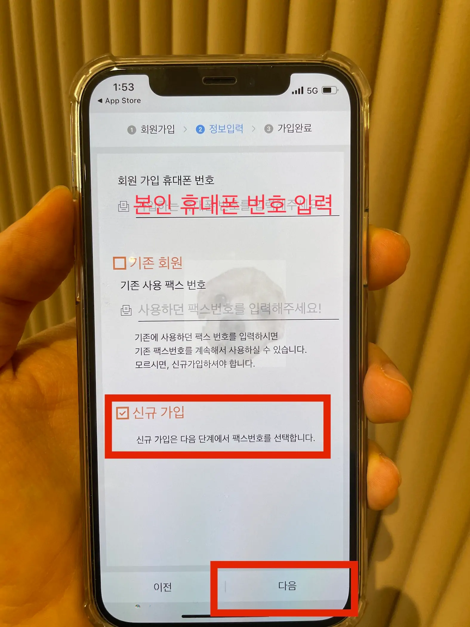 모바일 팩스 서비스를 새롭게 시작하고 해당 기기에 할당되는 팩스번호를 부여받기 위해서는 아래 사진처럼 본인 휴대폰 번호를 입력하고 아래에서 [신규 가입] 앞에 체크한 뒤에 [다음] 버튼을 터치하자.