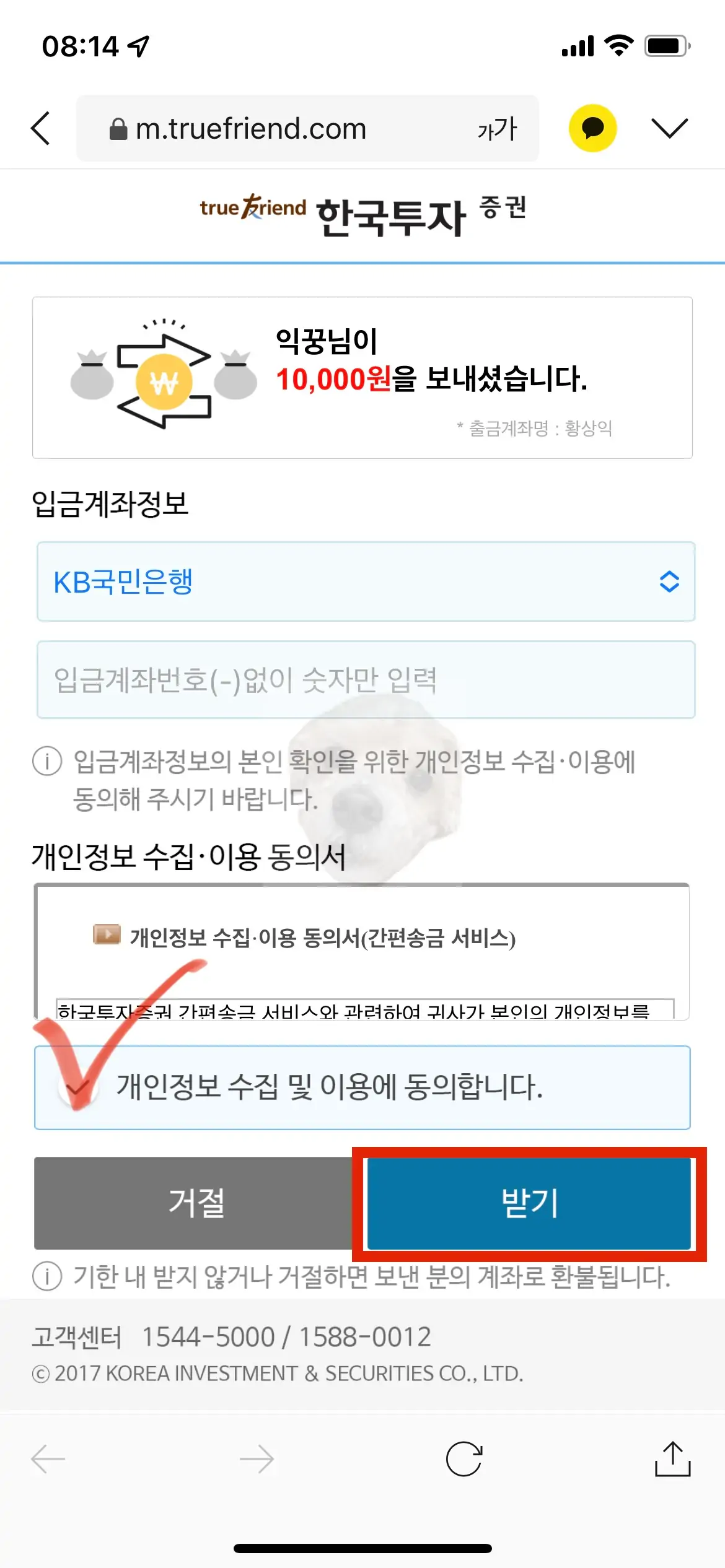 입금받을 은행명과 계좌번호를 입력하고 개인정보 수집 동의 후[받기] 버튼을 눌러주면 수수료 없이 계좌이체가 실행된다.