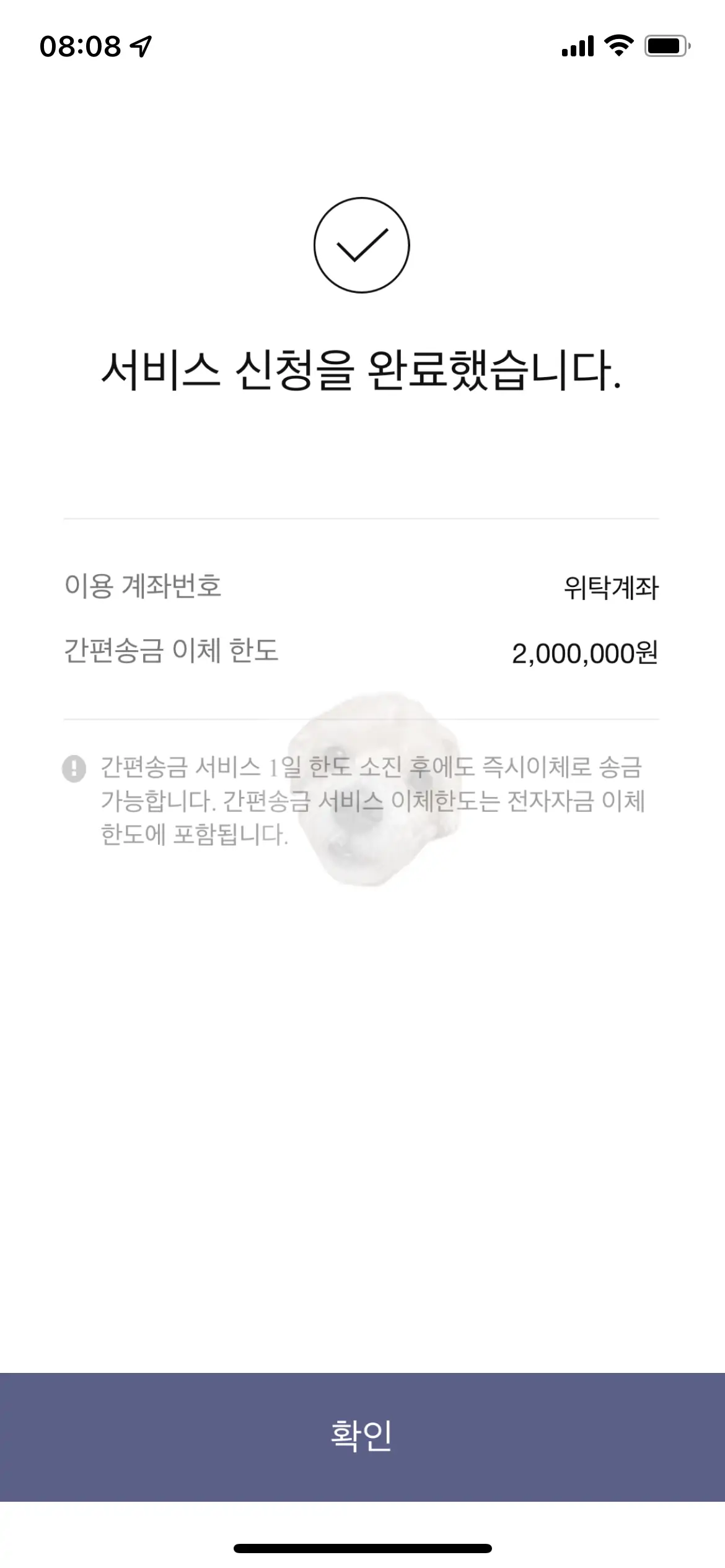 이체 수수료를 내지 않기 위해서 [간편송금 서비스]라는 걸 신청해야 한다. 아래 사진과 같은 안내문구가 나오면 [확인] 버튼을 터치해주자.