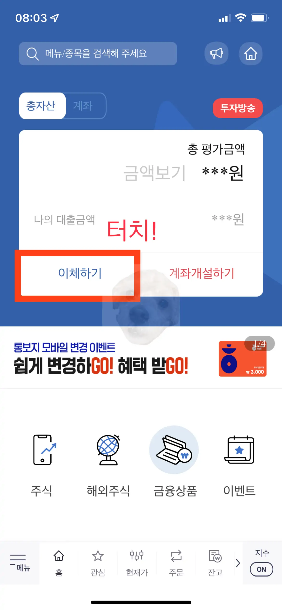 한국투자증권 앱 실행 후 이체하기 터치