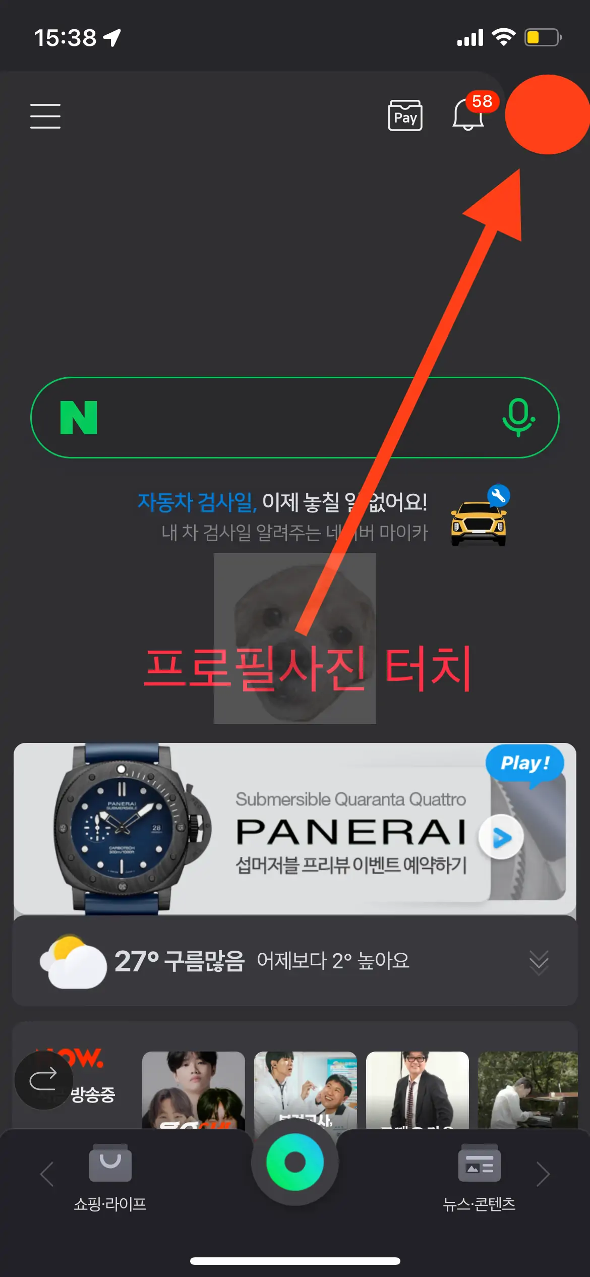 네이버 앱을 실행하면 좌측 하단 사진과 같은 화면이 가장 먼저 나올 것이다. 해당 사진에서 우측 상단에 보이는 내 프로필 사진을 터치해주자. 그러고 나서 보이는 [인증서] 항목을 터치한다.