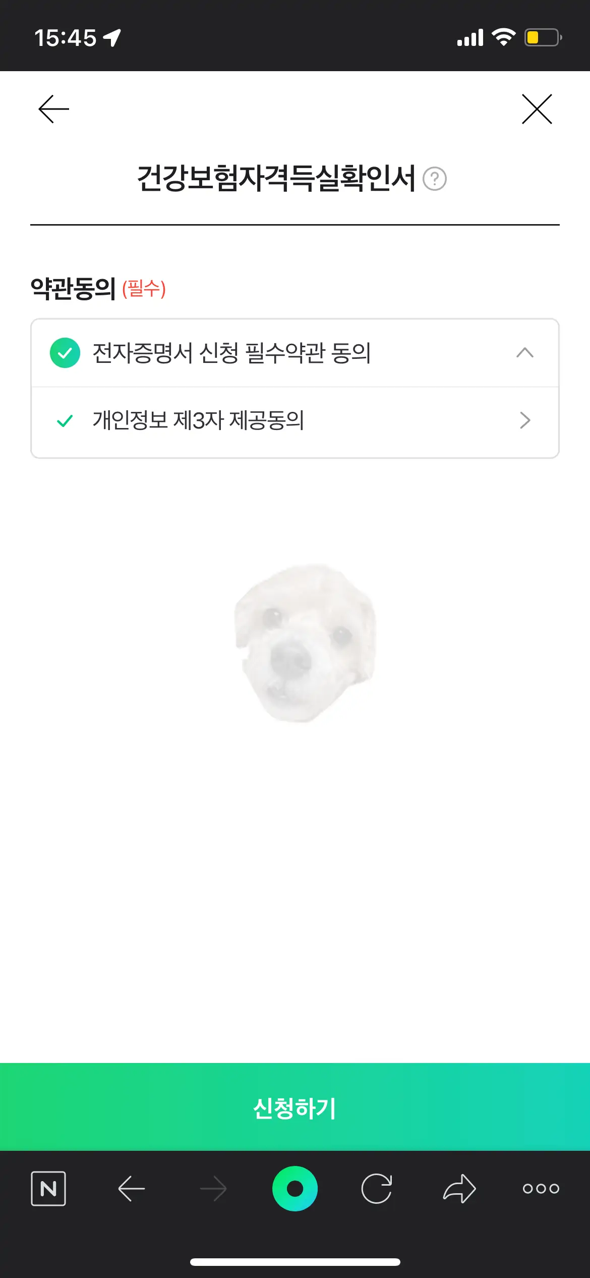 여러 메뉴 중[건강보험자격득실 확인서] 항목을 터치해주면 전자증명서 필수 약관 동의 후 아래 [신청하기] 버튼을 터치하면 발급절차가 모두 마무리된다.