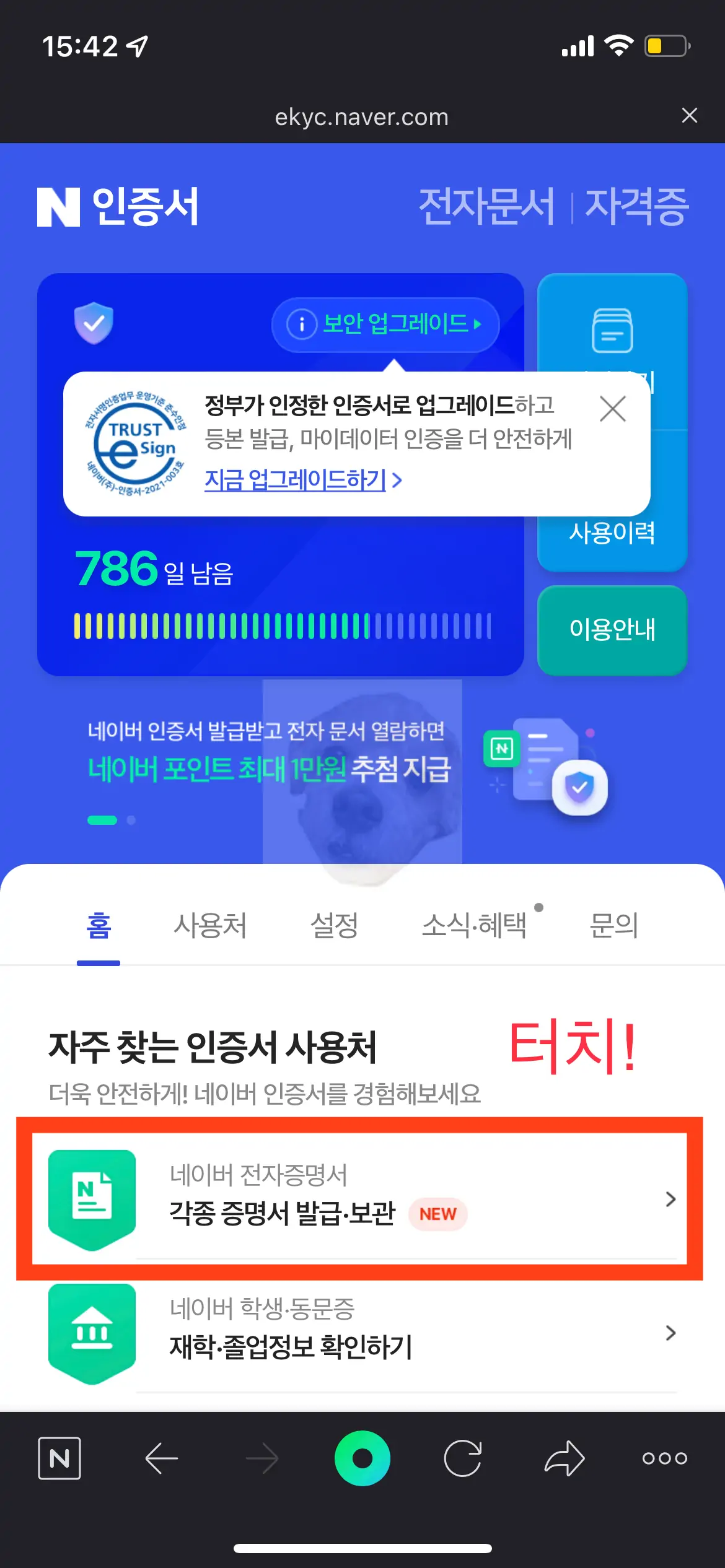 위의 설명대로 [인증서] 항목을 터치하면 아래 사진과 같은 화면이 나오는데 화살표로 표시해놓은 [인증서 홈] 부분을 터치해주자.