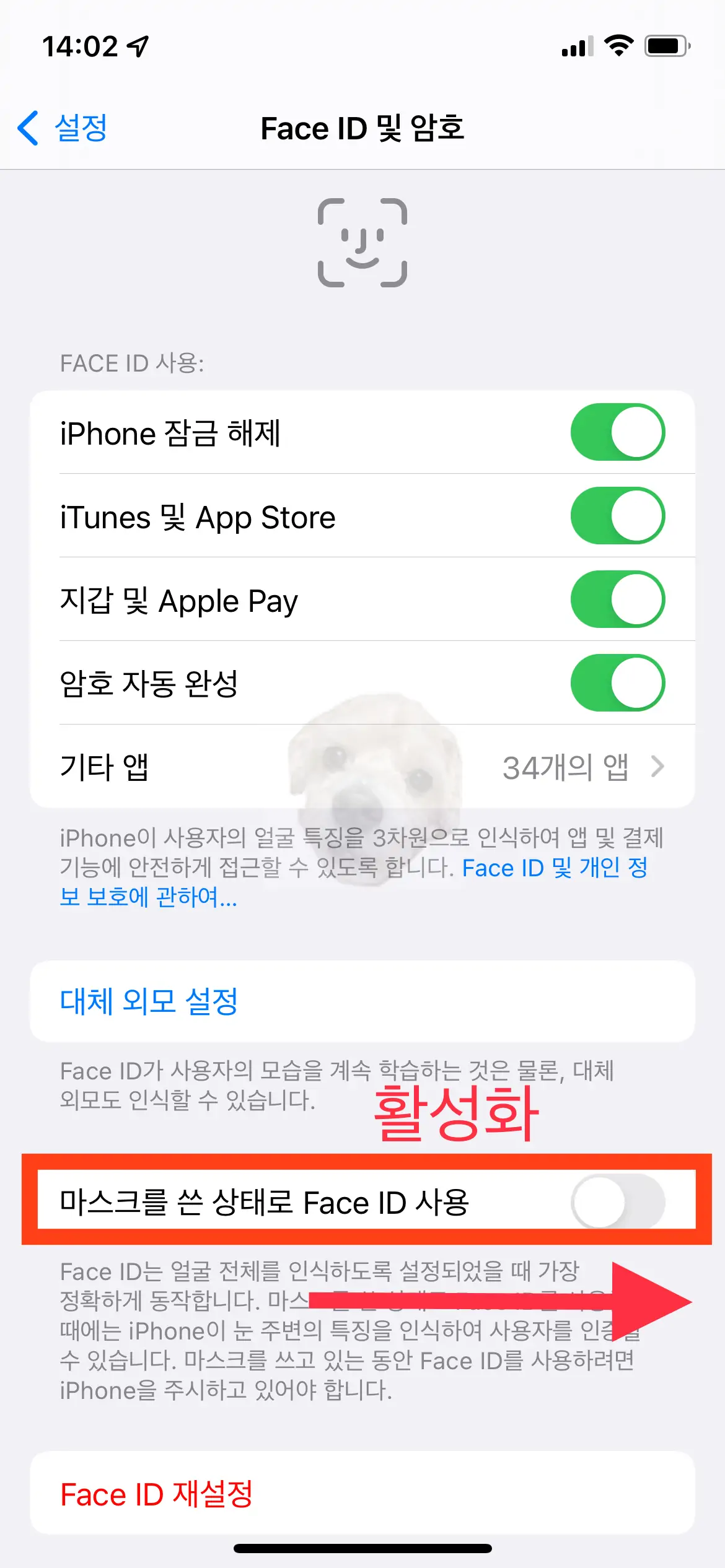 마스크를 쓴 상태로 Face ID 사용 활성화