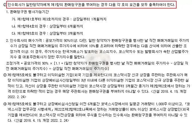 만약 공모주 청약을 하게 될 기업이 환매청구권 부여 조건을 모두 충족시켰다면 부여하고, 아래에서 보이는 정해진 기간 내에 일반 청약자가 원할 경우에는 다시 사가는 것이다.