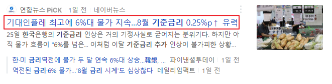 기대 인플레이션 사상 최고치 경신에 대한 뉴스가 지속적으로 나오면서 추가적인 금리인상에 대한 이야기가 끊임없이 나오고 있다. 한은이 발표했던 7월 기대인플레이션이 4.7%로 한 달 전 3.9%에
