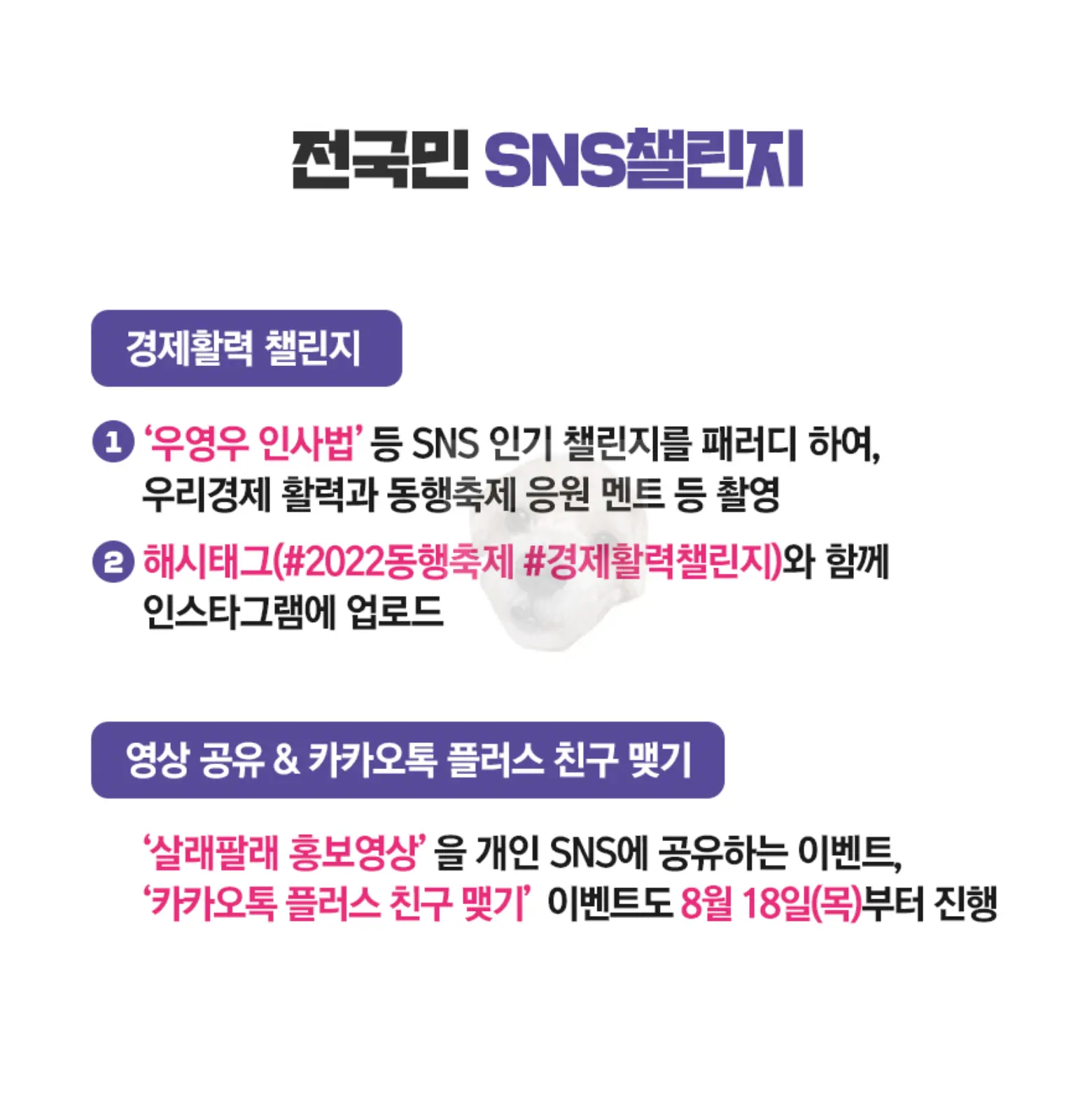 경제활력 챌린지는 어떤 양식 없이 요즘 SNS 상에서 유행하는 인기 챌린지를 패러디해서 우리 경제의 활력 및 동행 축제를 응원하는 멘트를 촬영하고 인스타그램에 해시태그(#2022 동행 축제 #경제활력 챌린지)를 걸어서 업로드해주면 된다.