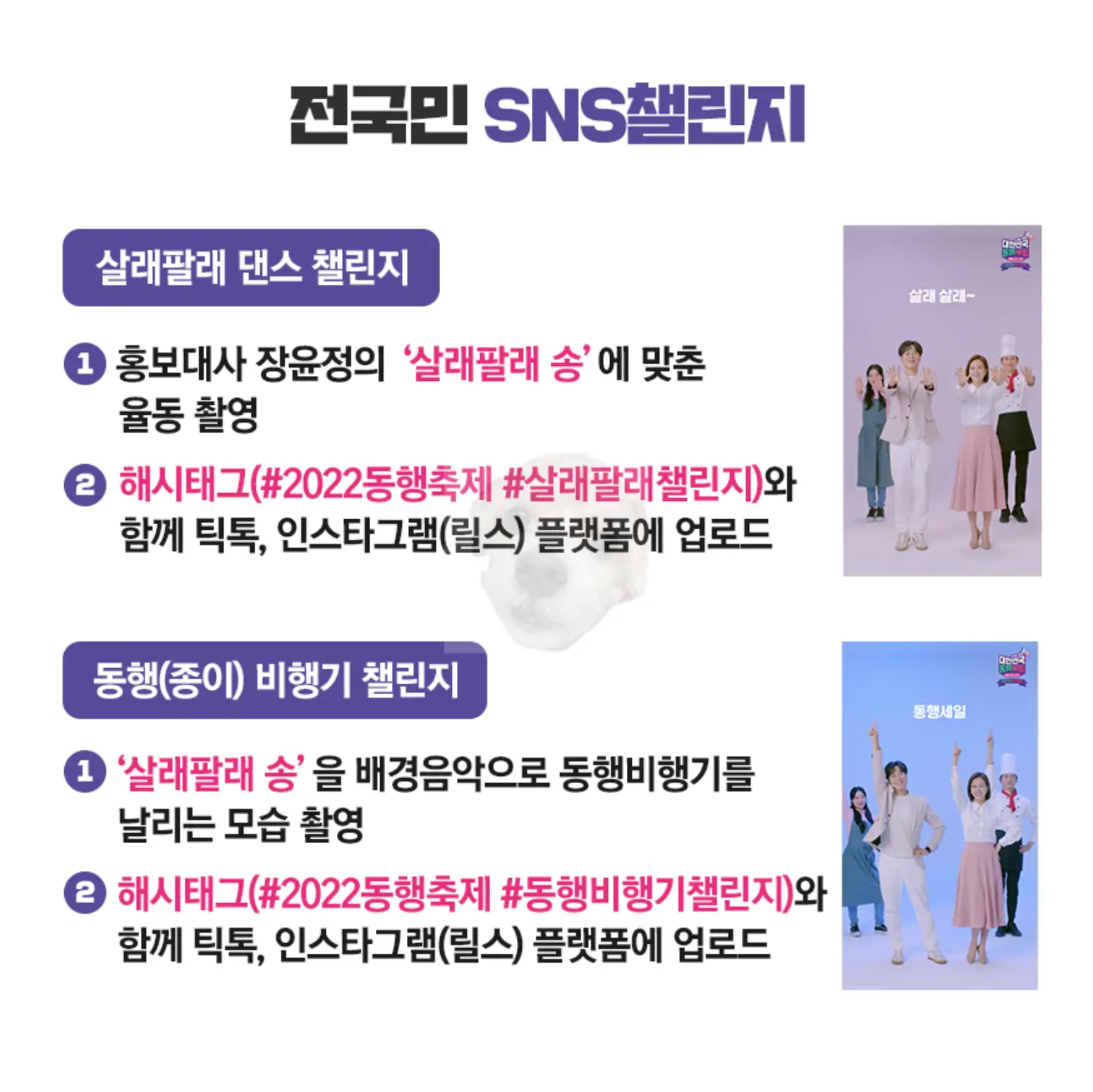 장윤정의 위 영상에서 나온 '살래팔래 송'에 맞춘 영상을 따라서 춤을 추고 해당 영상을 공유하면 참여가 끝나는 간단한 이벤트다. 요즘 젊은이들에게 많은 인기를 끌고 있는 틱톡이나 인스타그램 릴스를 통해서 해시태그(#2022 동행축제 #살래팔래챌린지)를 걸고 영상을 공유하면 참여가 완료된다.
