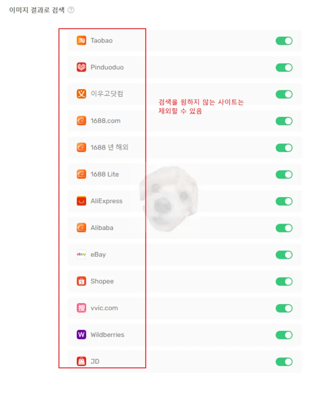 만약 내가 이미지 검색을 통해서 특정 사이트에서만 제품을 찾고 싶다면 아래 사진처럼 해당 프로그램의 [설정]에 진입해서 내가 사용하기를 원치 않는 사이트는 검색 사이트 중에서 제외를 하고 검색하는 방법도 있으니 참고하기 바란다.