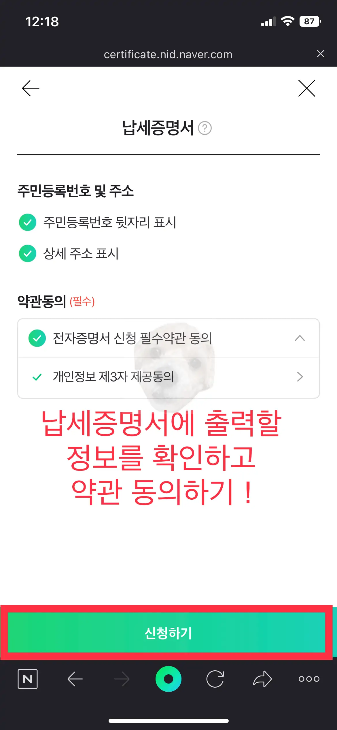 [전자증명서] 항목을 터치 후 나오는 화면에서 아래로 드래그 후 [납세증명서] 항목을 터치해주면 다음 화면으로 넘어간다. 주민등록번호 뒷자리와 상세 주소 표시 여부를 선택하고 약관에 동의 후 [신청하기] 버튼을 터치하자.