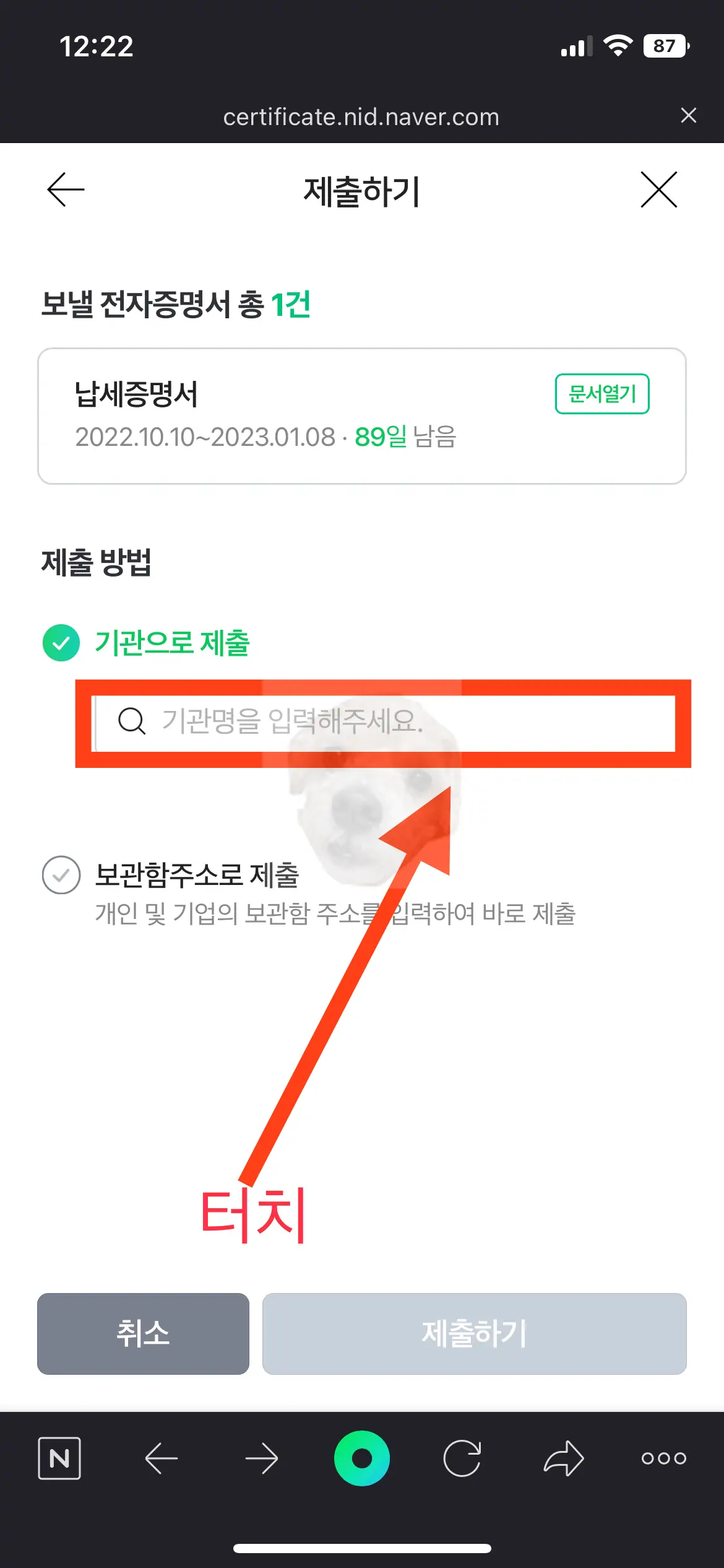 납세증명서 확인 후 제출할 기관 선택