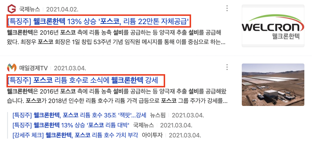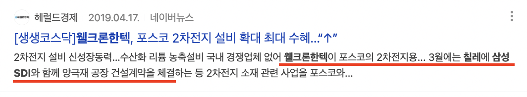 하지만 조금만 살펴보면 아래의 뉴스 기사에서 보는 것처럼 포스코에 수산화리튬 설비를 공급했기 때문이며, 삼성 SDI와도 칠레 리튬 프로젝트에 참여하면서 리튬 관련주로 묶일 수밖에 없는 사업을 많이 해왔다.