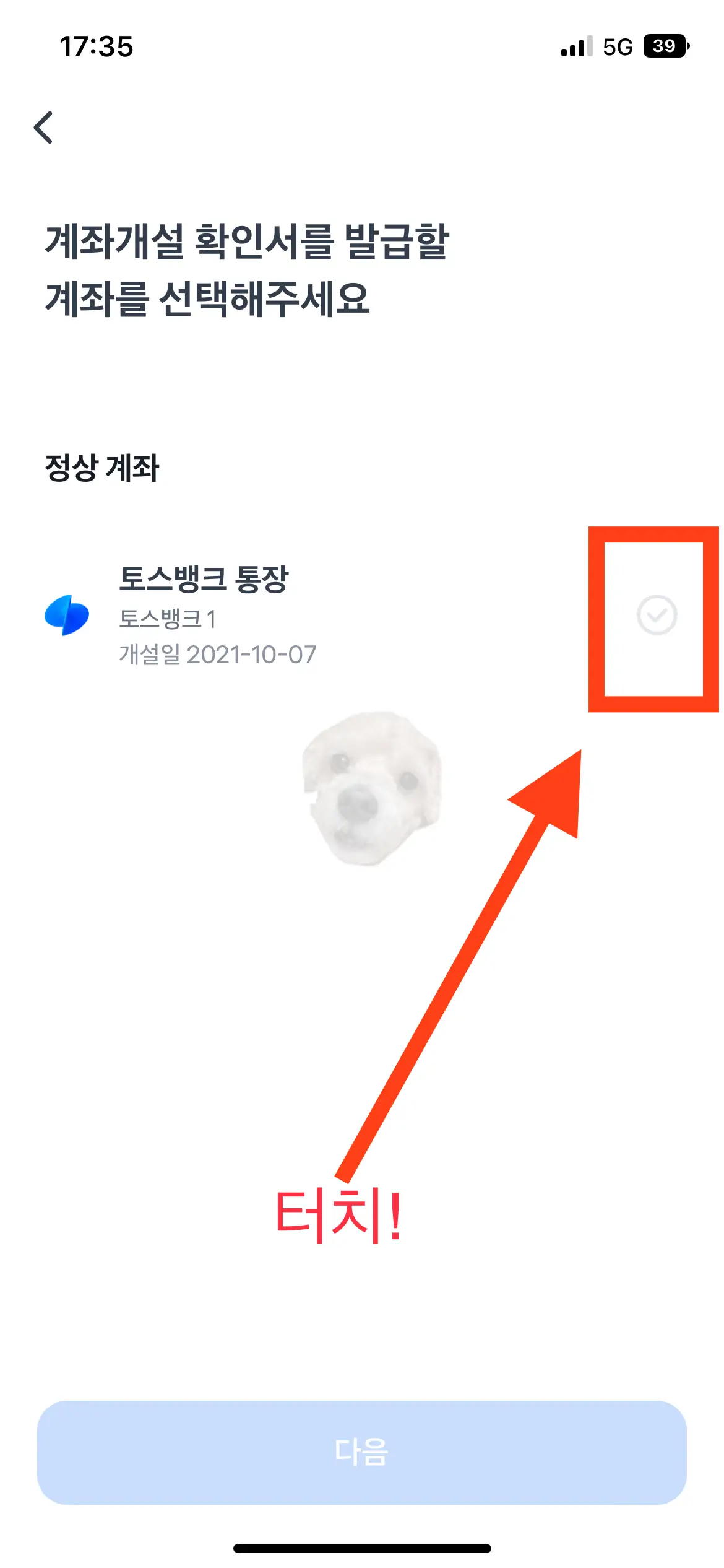 계좌가 여러 개인 경우는 여러 계좌 중에서 하나를 선택해야 하지만, 나는 계좌가 한 개라서 체크박스 선택 후 [다음] 버튼을 눌러주었다.