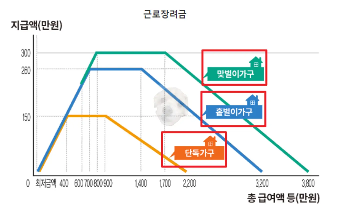 | 홑벌이가구 | 근로장려금 | 4만 원 ~ 3,000만 원 | 3만 원 ~ 260만 원 |