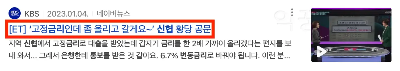 그렇다. 사람들은 대부분 한 번 고정금리로 돈을 빌려놓으면 '나는 고정이라서 상관없다'라는 식으로 이야기하는 경우를 주변에서 많이 봤다. 하지만 얼마 전 크게 이슈가 되었던 '신협 사건'에 대해서 들어본 사람이 분명 있을 것이다.