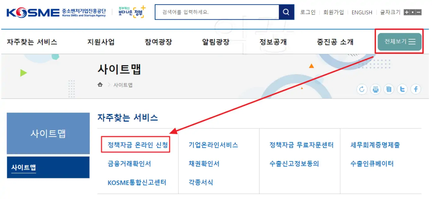 위 사진처럼 중진공 홈페이지 접속 후 우측 상단에 보이는 [전체 보기] - [정책자금 온라인 신청] 순서대로 클릭해 주자.