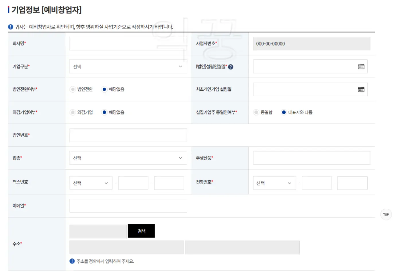 이미 창업을 한 경우라면 더더욱 입력하기 쉬울 것으로 생각된다. 빈칸을 모두 채우도록 하자. 특히 빨간 별 모양이 있는 곳은 필수기재해야 한다.