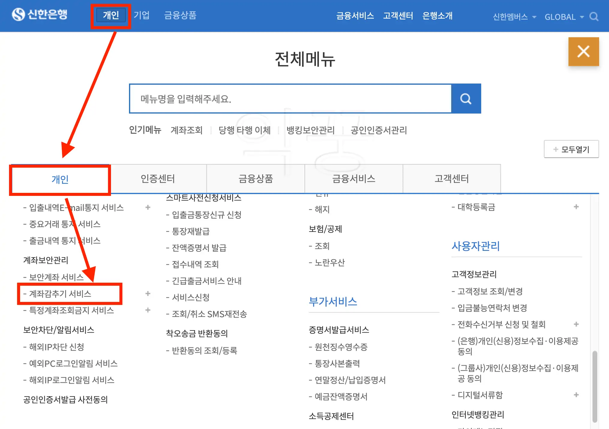 - [개인] - [계좌 감추기 서비스]를 클릭해서 스텔스 통장 설정 가능