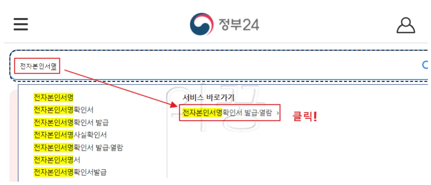 검색창에 '전자본인서명'을 검색하면 아래 사진처럼 '서비스 바로가기'라는 글자 아래 [전자본인서명확인서 발급/열람]이라는 글씨가 보인다. 클릭해 주자.