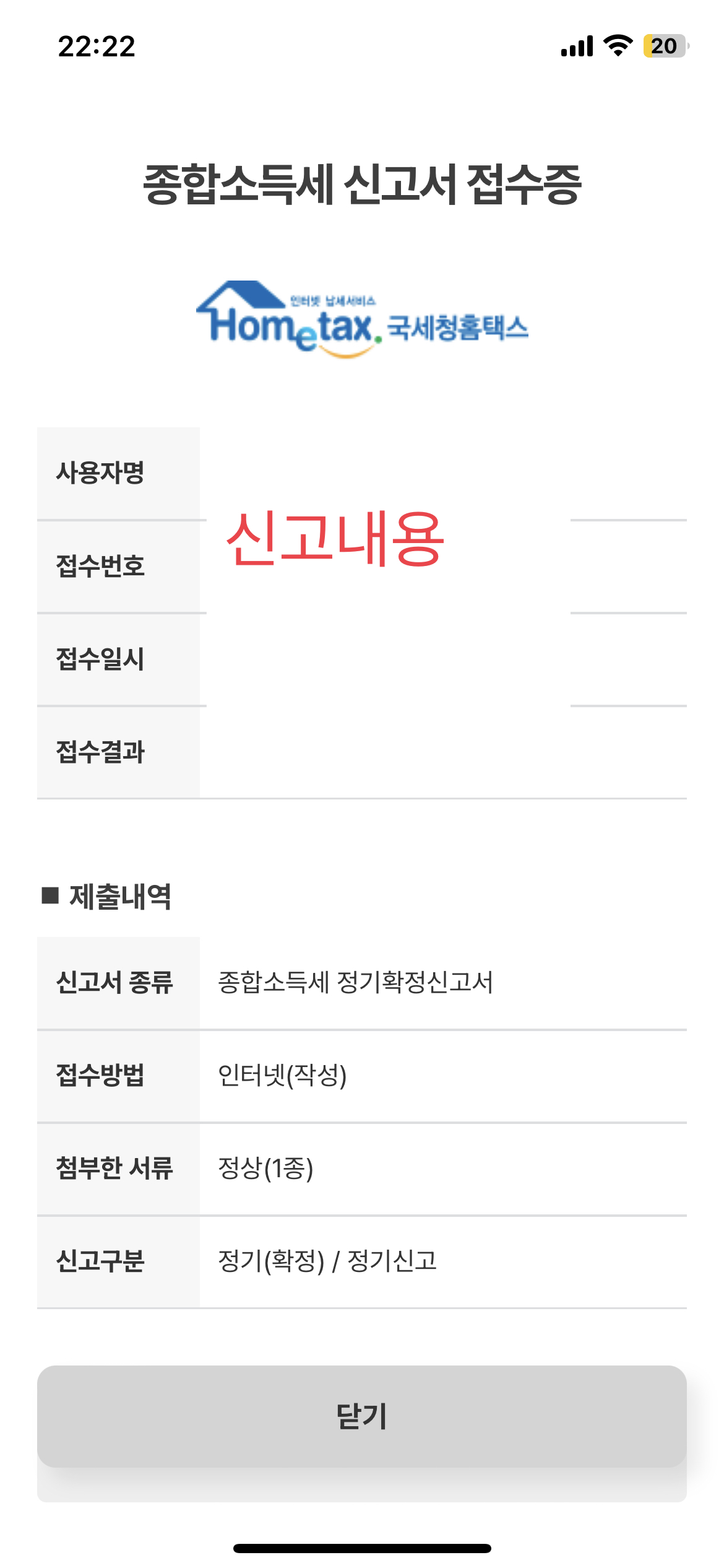 아래 사진처럼 카드번호/만료일/카드비밀번호 앞 두 자리/생년월일을 모두 입력하고 [결제하기] 버튼을 눌러주면 결제가 진행되고 자동으로 종합소득세 신고가 마무리된다.