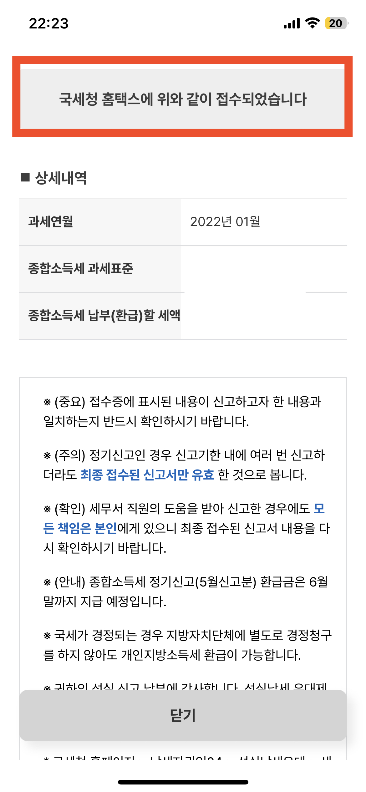 신고가 완료되면 등록된 휴대전화에 문자로 가상계좌가 발송되고 내가 종합소득세 신고를 한 내역에 대해 [접수증 보기] 버튼을 클릭해서 확인하는 것도 가능하다.